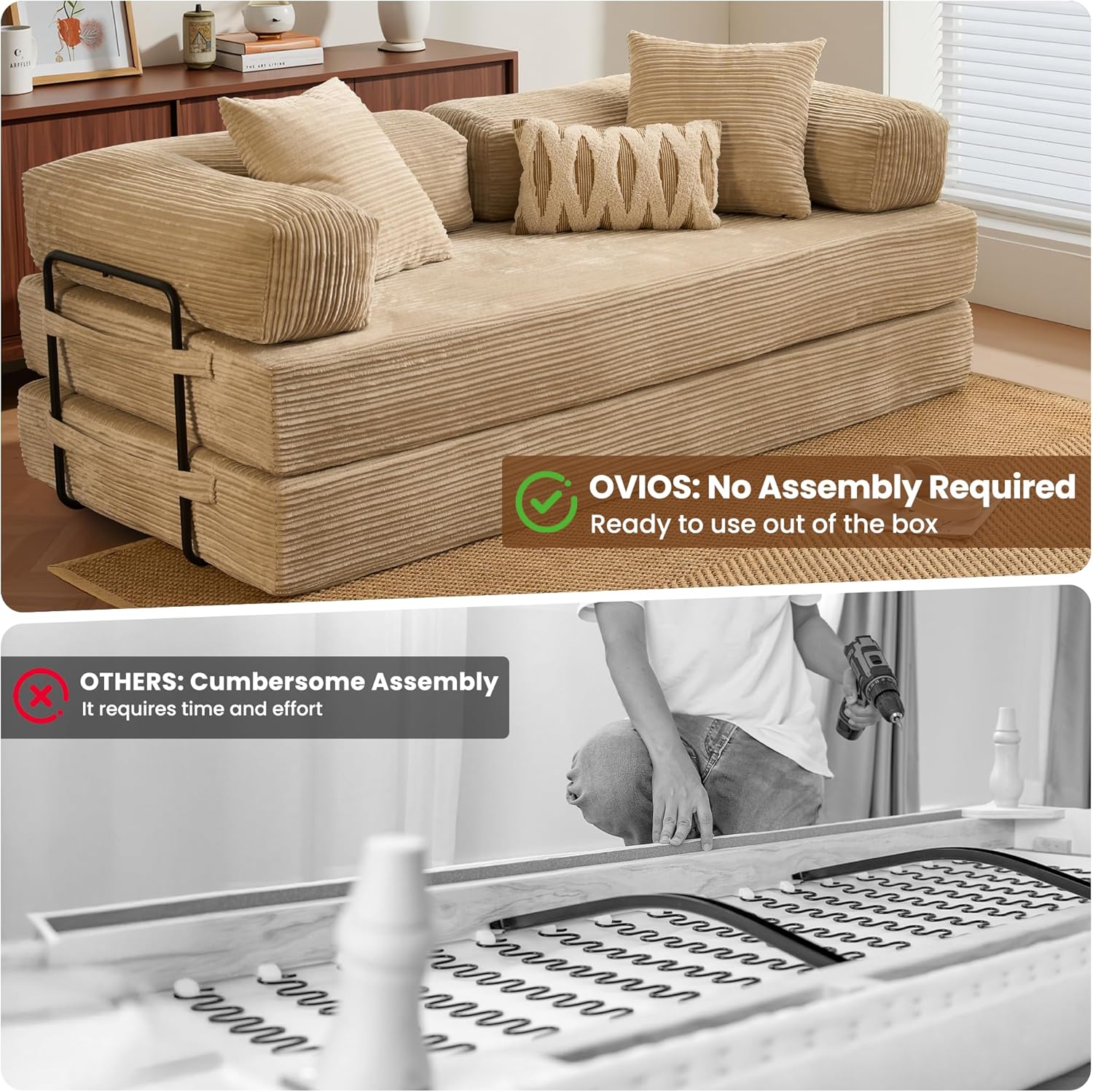 No Assembly Required: Get rid of the hassle of typical furniture installation with our floor couch sofa. Our giant folding mattress with cushions and pillows is packed in vacuum compression. Please leave it alone for 24-48 hours after receiving and opening so that the sponge can fully expand. Simply disassemble all parts and gently tap each section to restore its elasticity and fluffiness