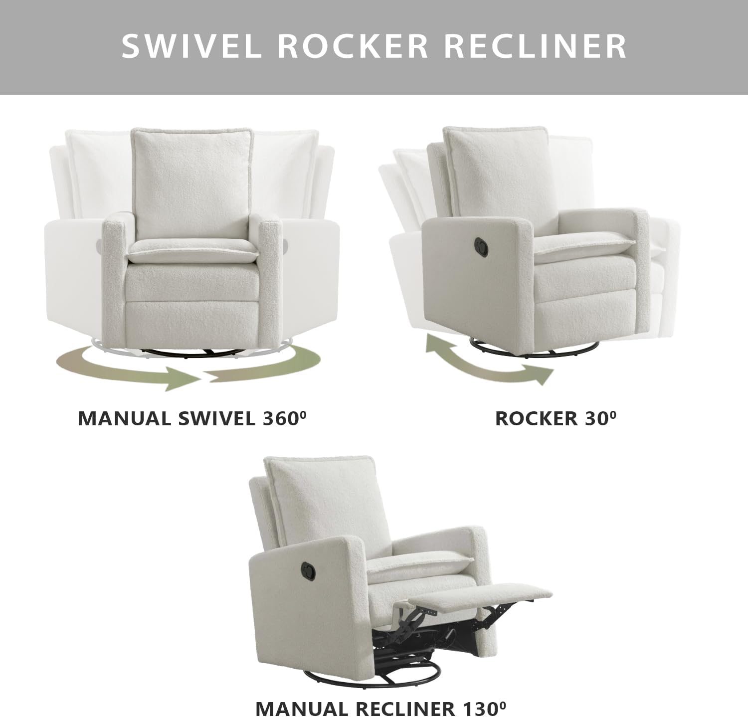 GENDER NEUTRAL FOR EVERY ROOM: This glider recliner comes in a beautiful gender neutral tone Boucle White. It's light neutral tone blends well and adapts beautifully into any room environment.