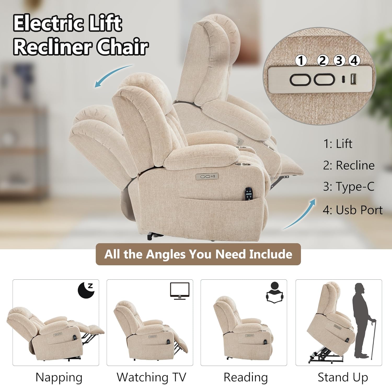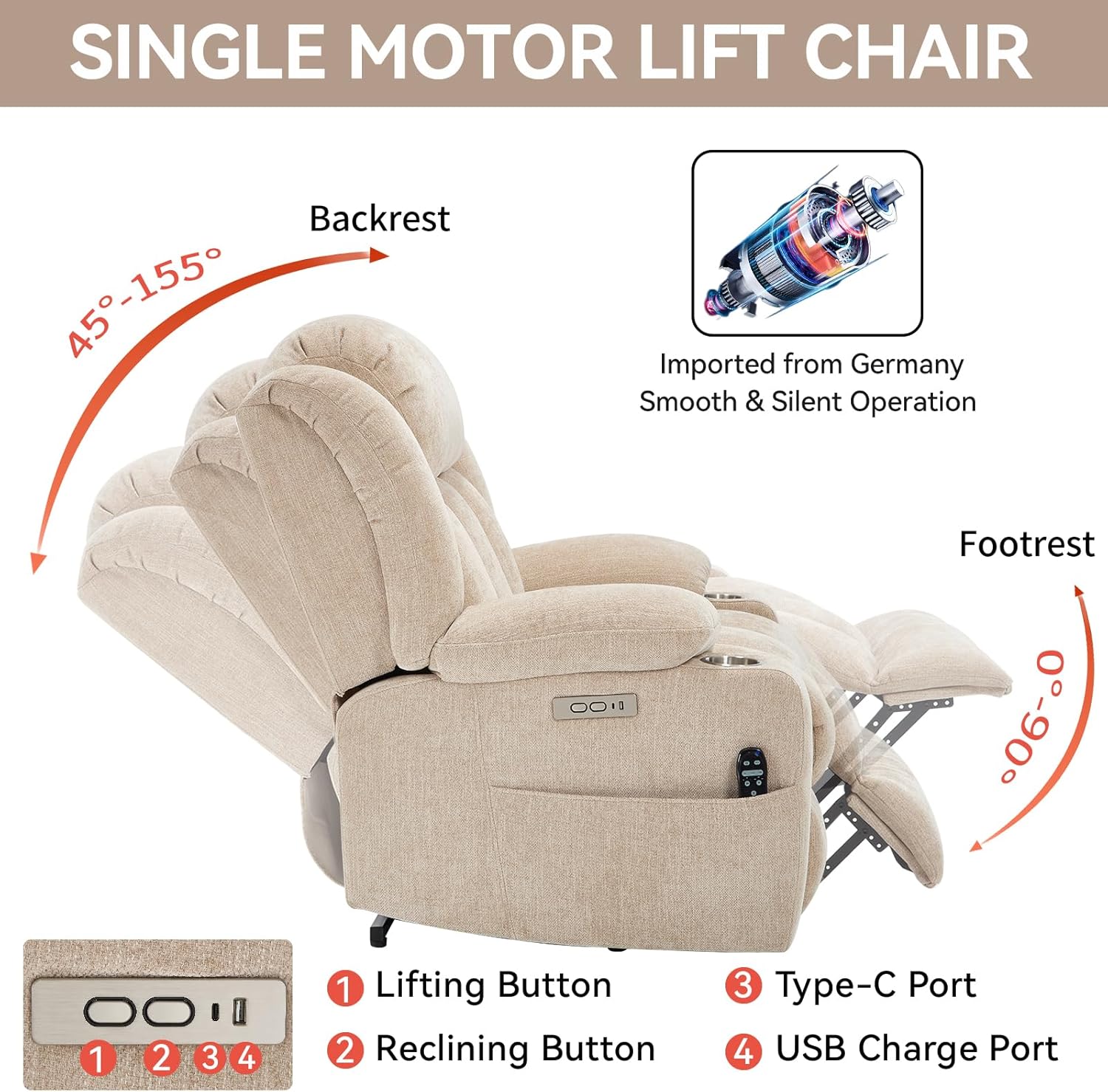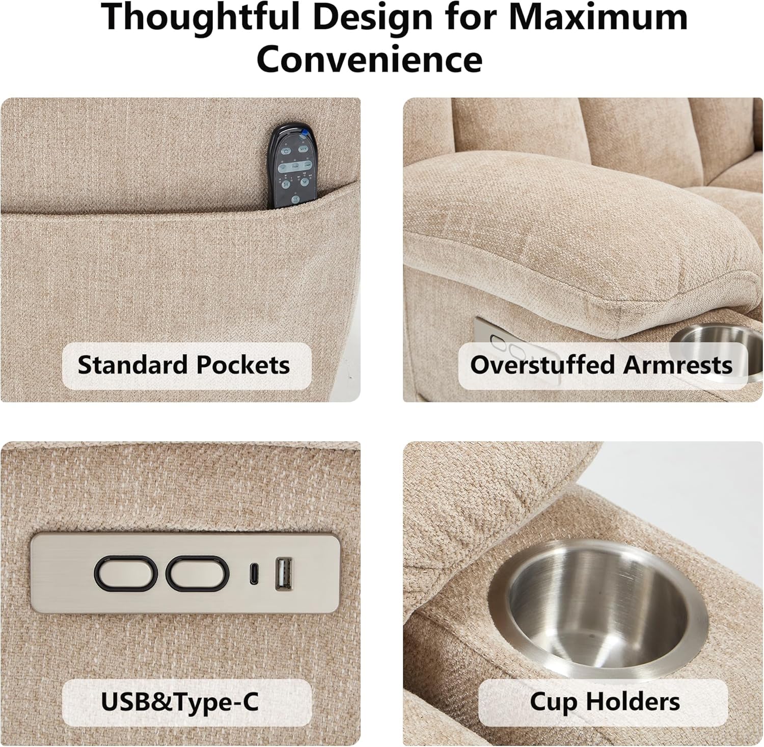 Dual USB Ports & Convenient Cup Holders: Stay connected and refreshed. This power recliner features dual USB ports (Type-A & Type-C) to charge your devices without leaving your seat. The built-in stainless steel cup holders keep your drinks within easy reach. It's the perfect electric recliner for relaxing, watching TV, or reading.