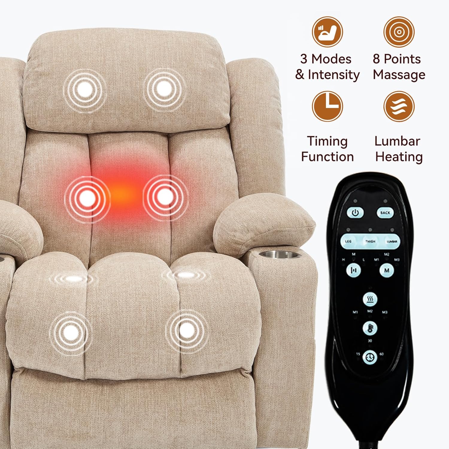 8-Point Massage & Soothing Lumbar Heat Therapy: Enjoy personalized relaxation with 8-point vibration massage recliner and soothing lumbar heat. Target specific areas like back, thighs, or legs individually. Choose from 3 modes and set a 15-60 minute timer. The heating recliner function helps ease muscle stiffness and improve circulation, offering a spa-like experience at home.