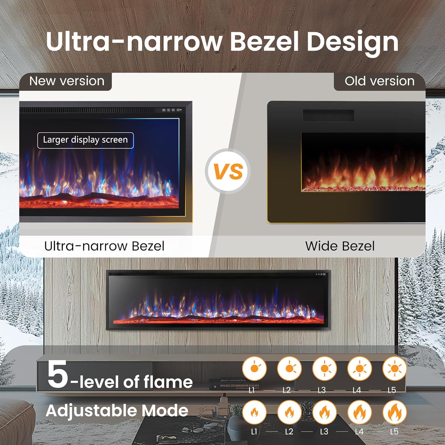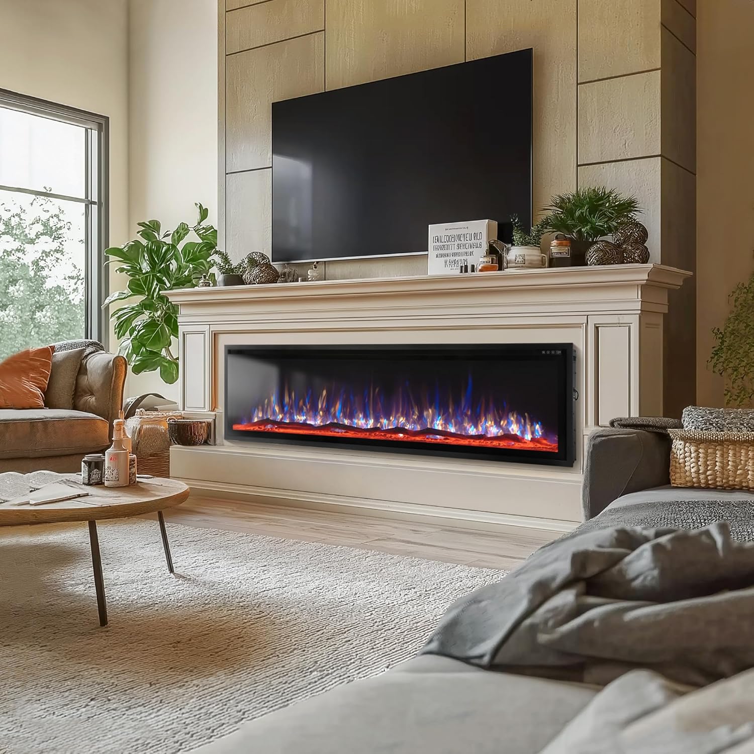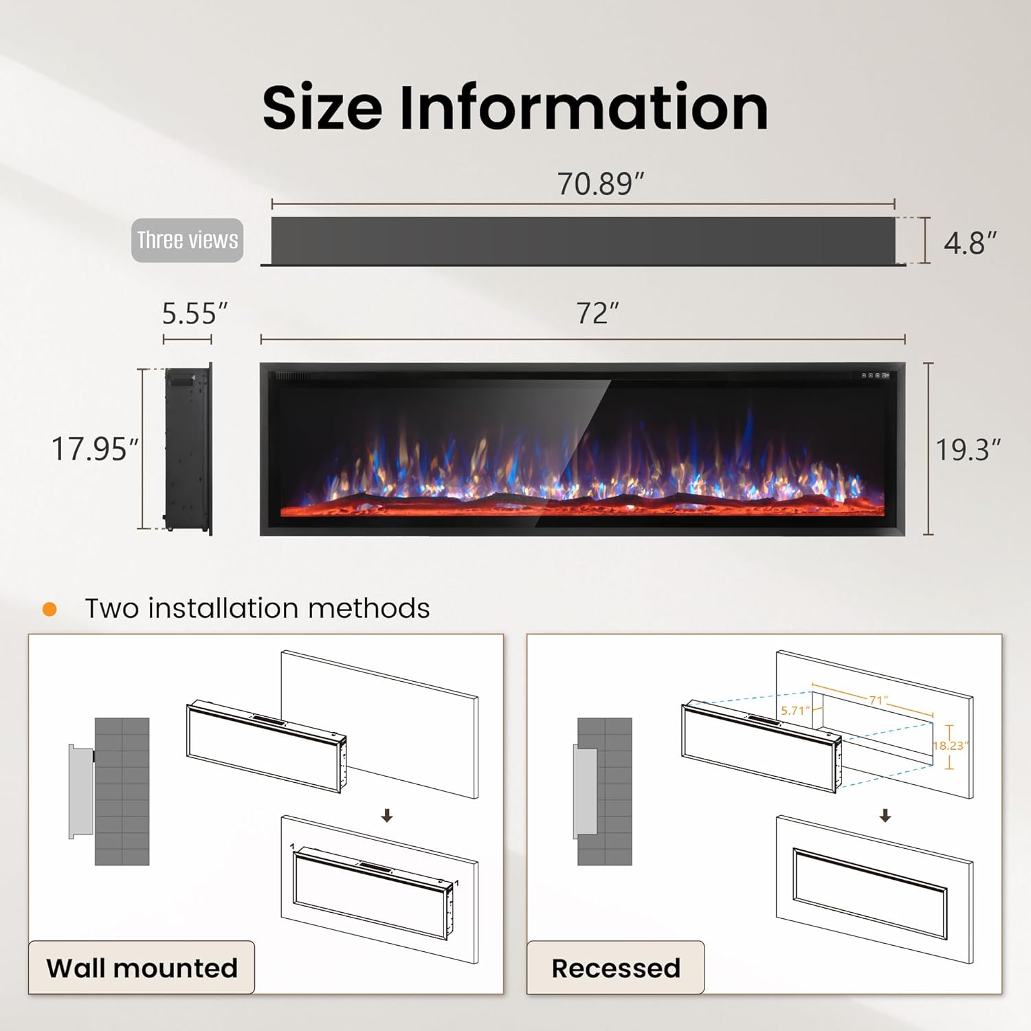 Wall-Mounted or Recessed Installation: Transform your living space with our stunning 72" electric fireplace. Its expansive screen and luxurious 3D visual experience make it a chic addition to any modern living room, bedroom, or office. Dimensions: 72" W x 19.3" H x 5.55" D; 71" W x 18.23" H x 5.71" D.