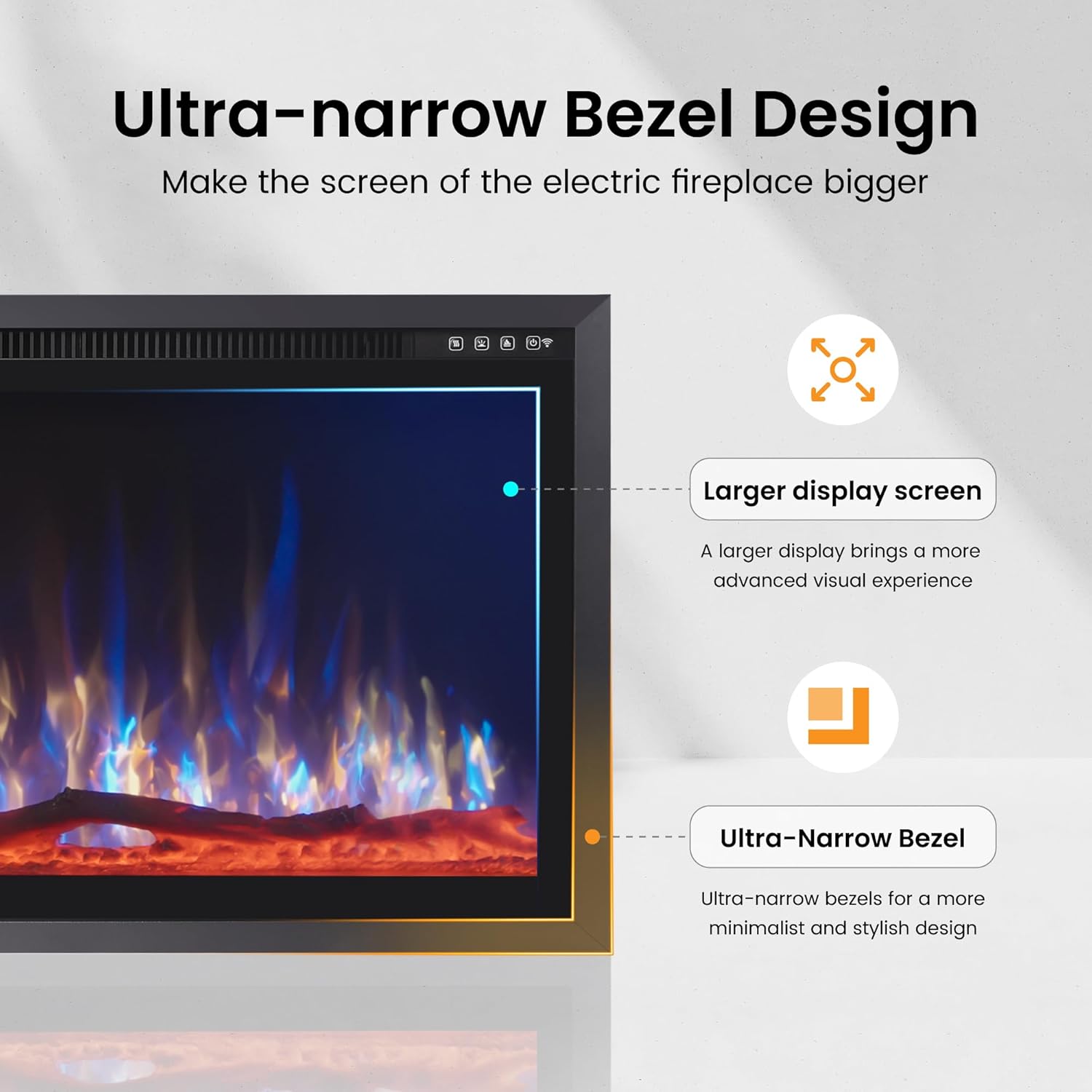 Realistic Flame with Custom Inserts (Over 250 Combinations): Personalize your fireplace with over 250 design options using crystal, faux charcoal, or faux firewood inserts. Experience the lifelike flame with 7 vibrant colors, 12 carbon bed hues, 5 brightness levels for both the flame and carbon bed independently, and 5 flame speeds. Create the ideal ambiance for any occasion, with or without heat.