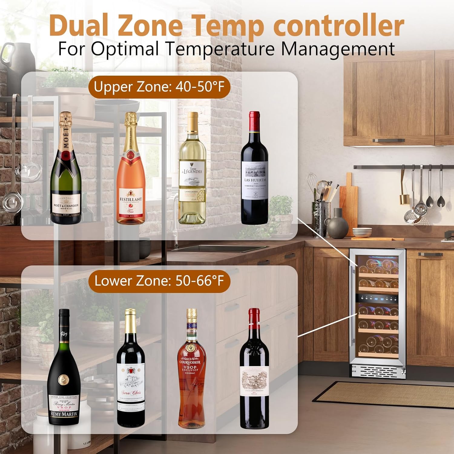 BUILT-IN/ FREESTANDING - 15 Inch Wine Refrigerator, 29 Bottle Dual Zone Refrigerator with 5 Removable Wooden Shelves. DIY Shelf Quantity & Position to meet your storage needs. Fridge size: 14.9"W x 22.4"D x 33.9"H.