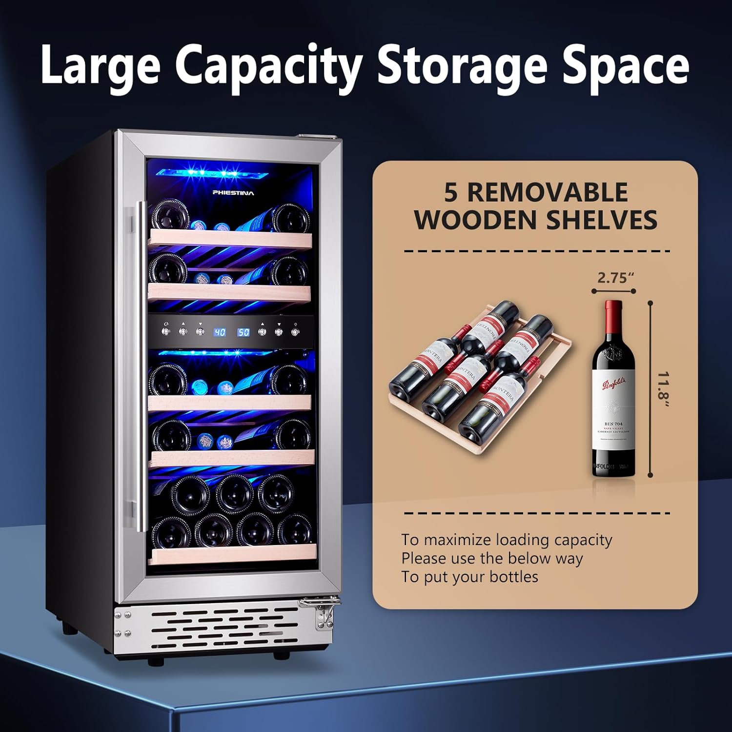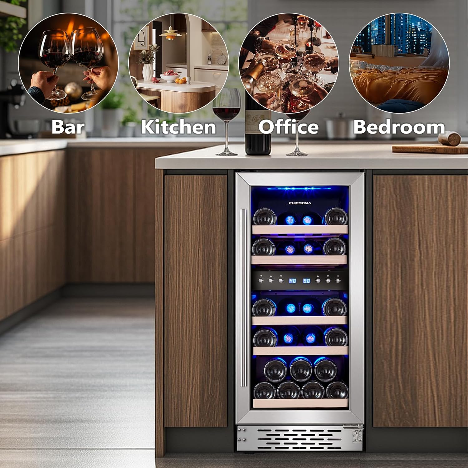 TRANSPARENT GLASS DOOR - This gorgeous wine cooler with blue light is a fantastic way to show off your precious collection, even at night! Perfect for any setting, you can place this wine cooler in your kitchen, bar, hotel or office, or even under the counter or in a freestanding one!