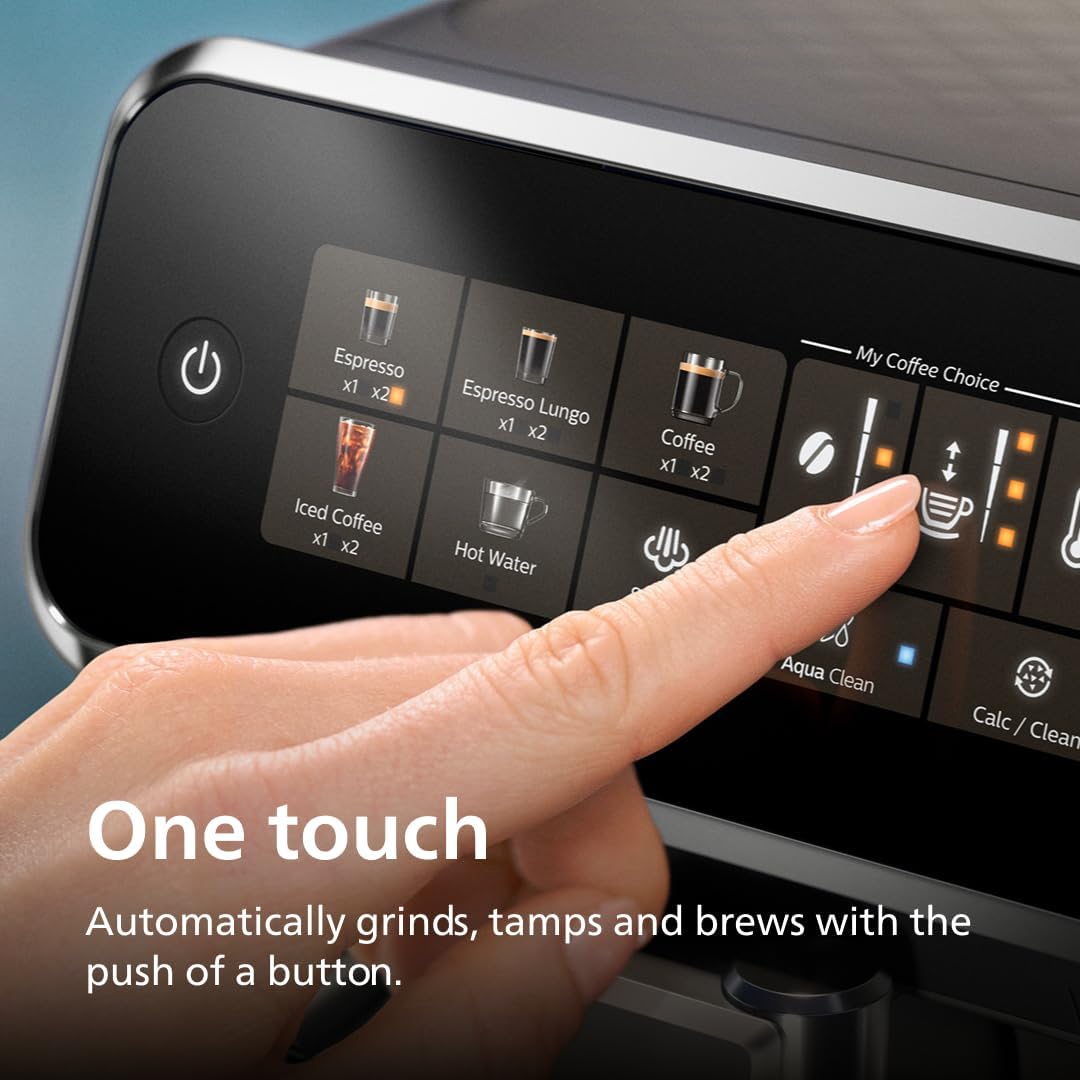 • 3300 Series Fully Automatic Espresso Machine with integrated milk frother and grinder, 5 Hot & Iced Coffee Pre-Sets, 40% Quieter SilentBrew, 15-Bar Pressure, Glossy Black (EP3326/90)