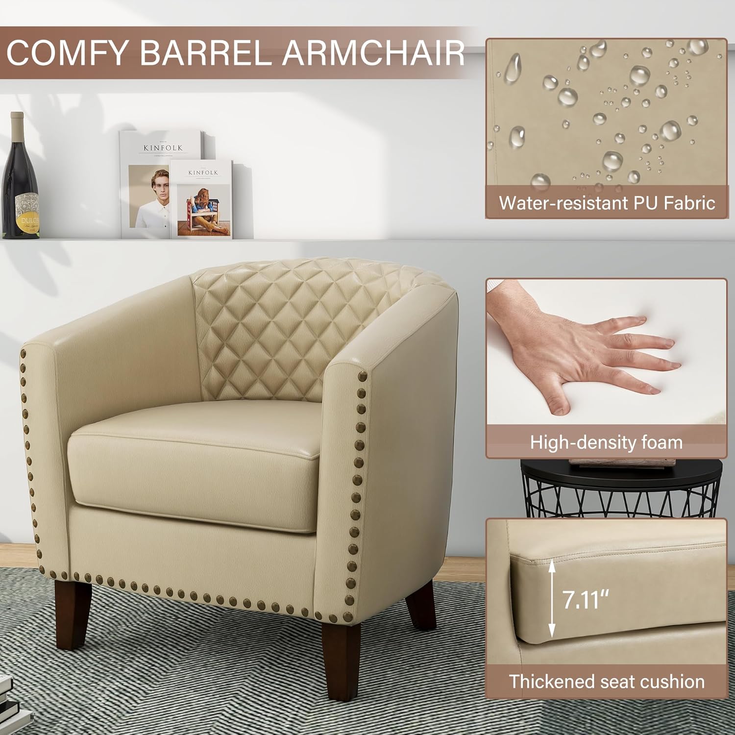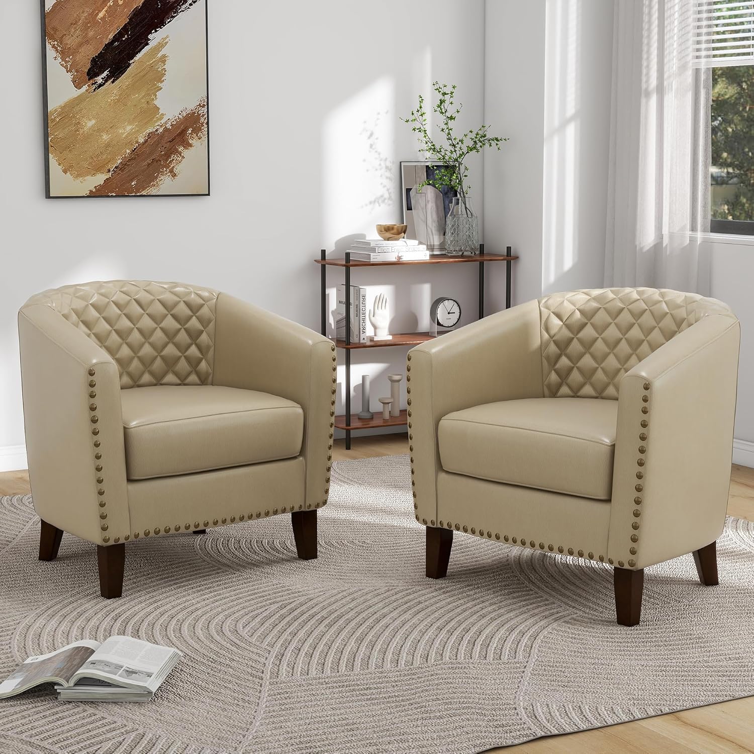 • Faux Leather Barrel Chairs Set of 2, Modern Comfy Accent Chairs, Upholstered Armchair Club Chairs with Nailhead Trim, Single Sofa Barrel Chair for Living Room Reading Room, Beige