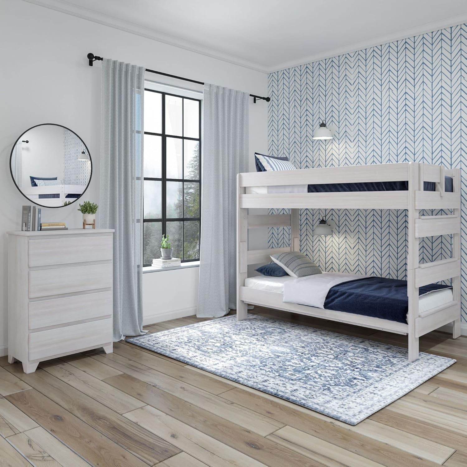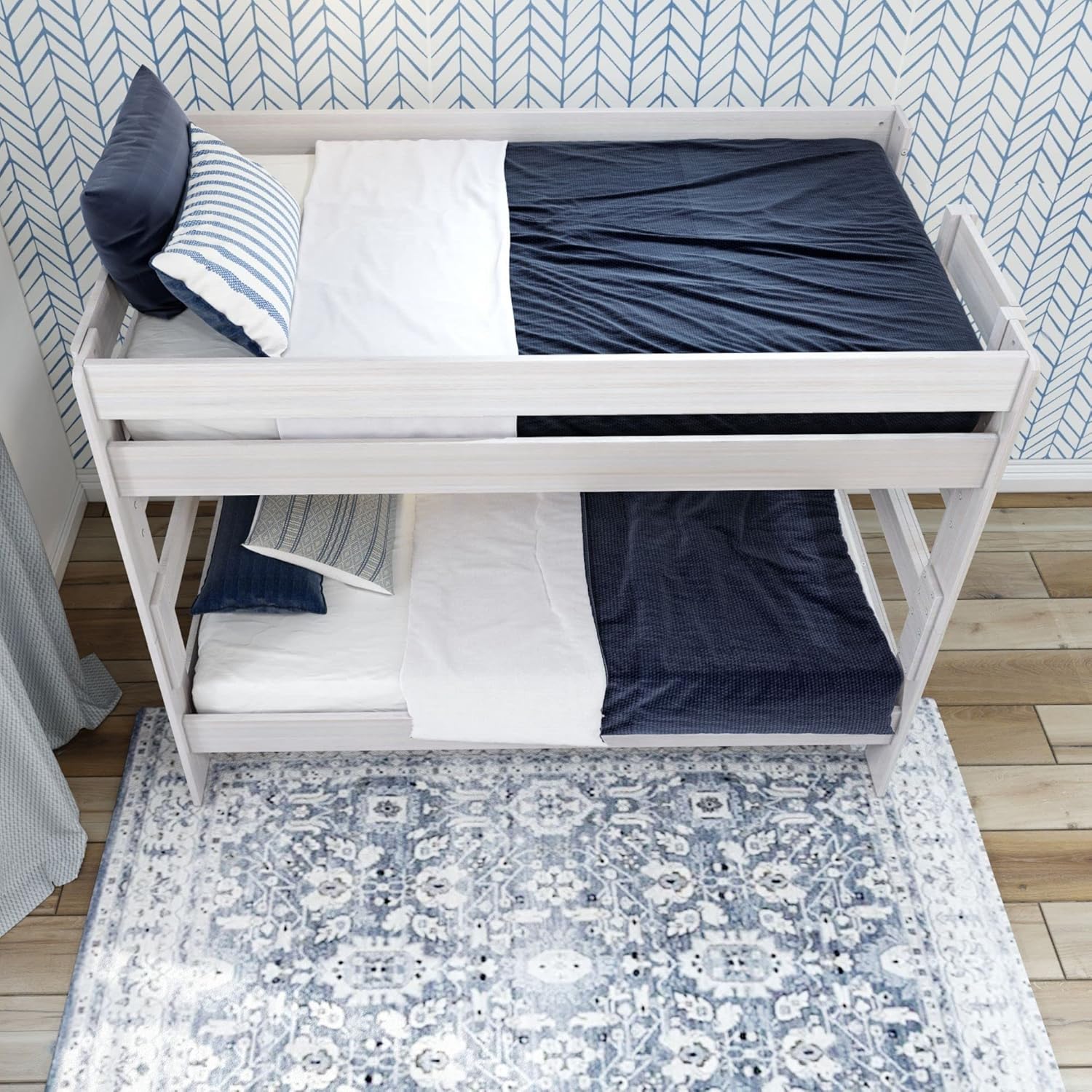 Country-chic with a modern twist. Our Rustic Twin over Twin Bunk Bed blends timeless design elements with contemporary styling that pairs with any decor. Crafted with solid New Zealand pine wood for a beautiful look and feel. Durable, low VOC finishes are perfect for a clean and healthy home. Solid plywood slats and metal support bar supports a high 400 lb weight capacity. The built-in ladder maximizes the space in your room. Rustic, neutral color finishes and hardware provide elegant details. Take your style to new heights.