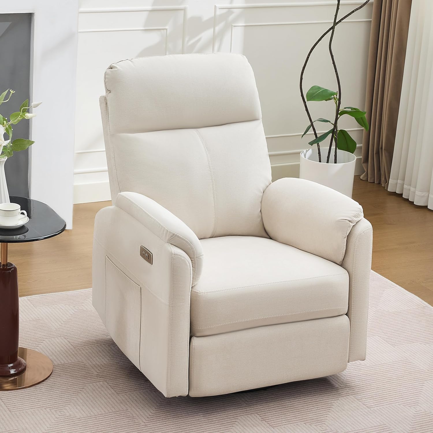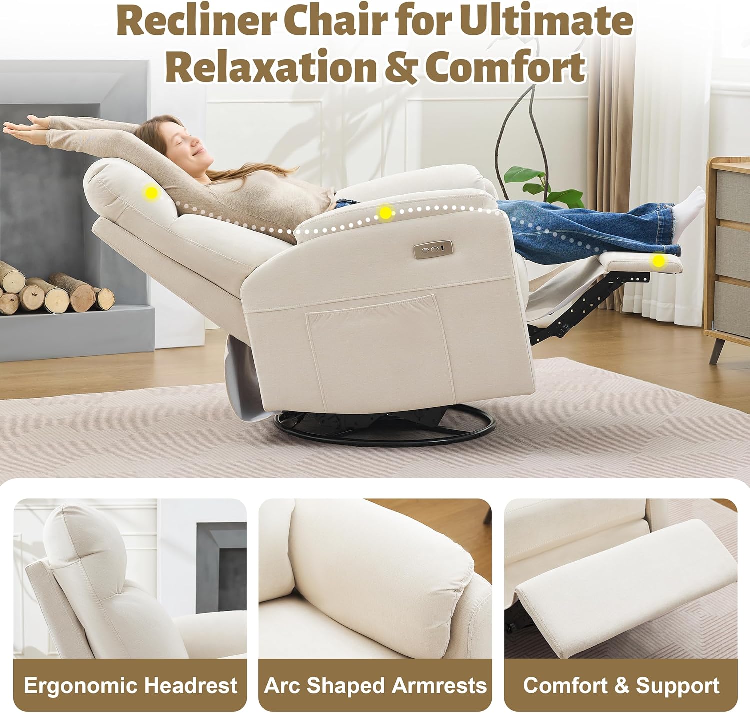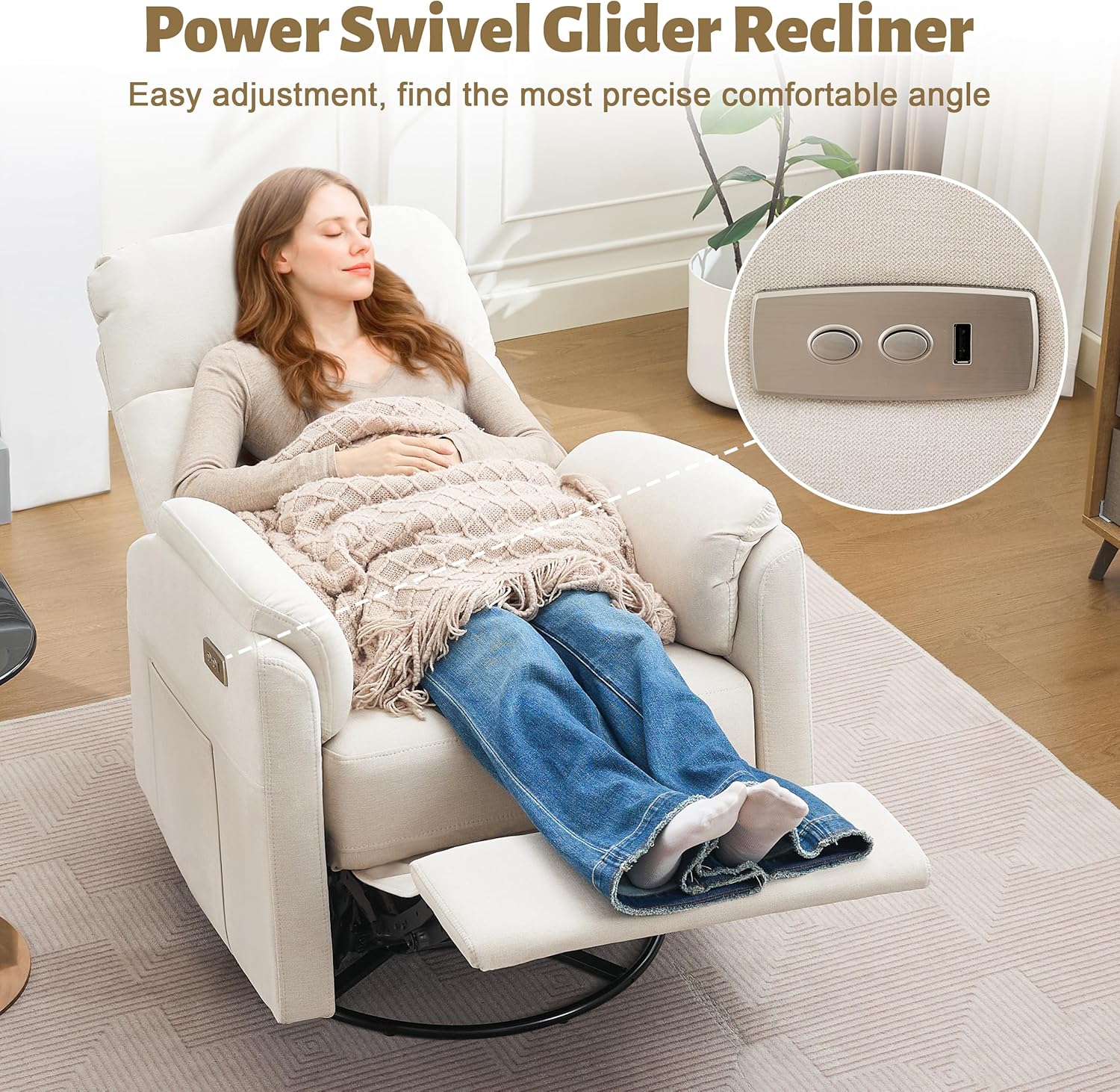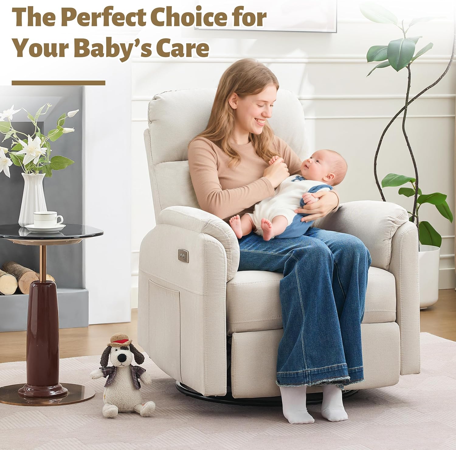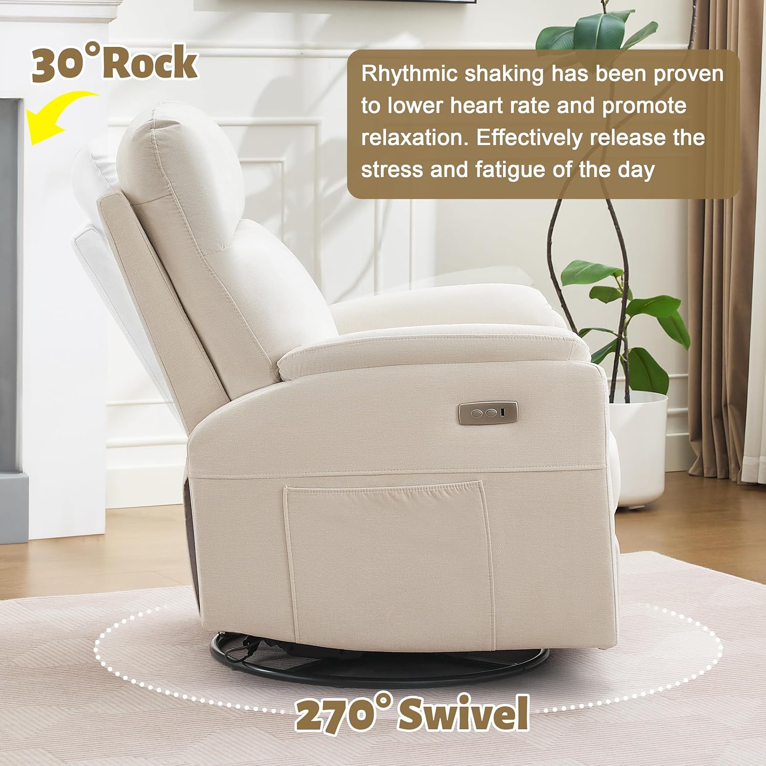 Convenient Power Recliner: The power recliner chair offers easy one-touch control, smoothly synchronizing the backrest and footrest through a 105 to 165 range to effortlessly find the perfect angle for feeding, soothing, or relaxing.