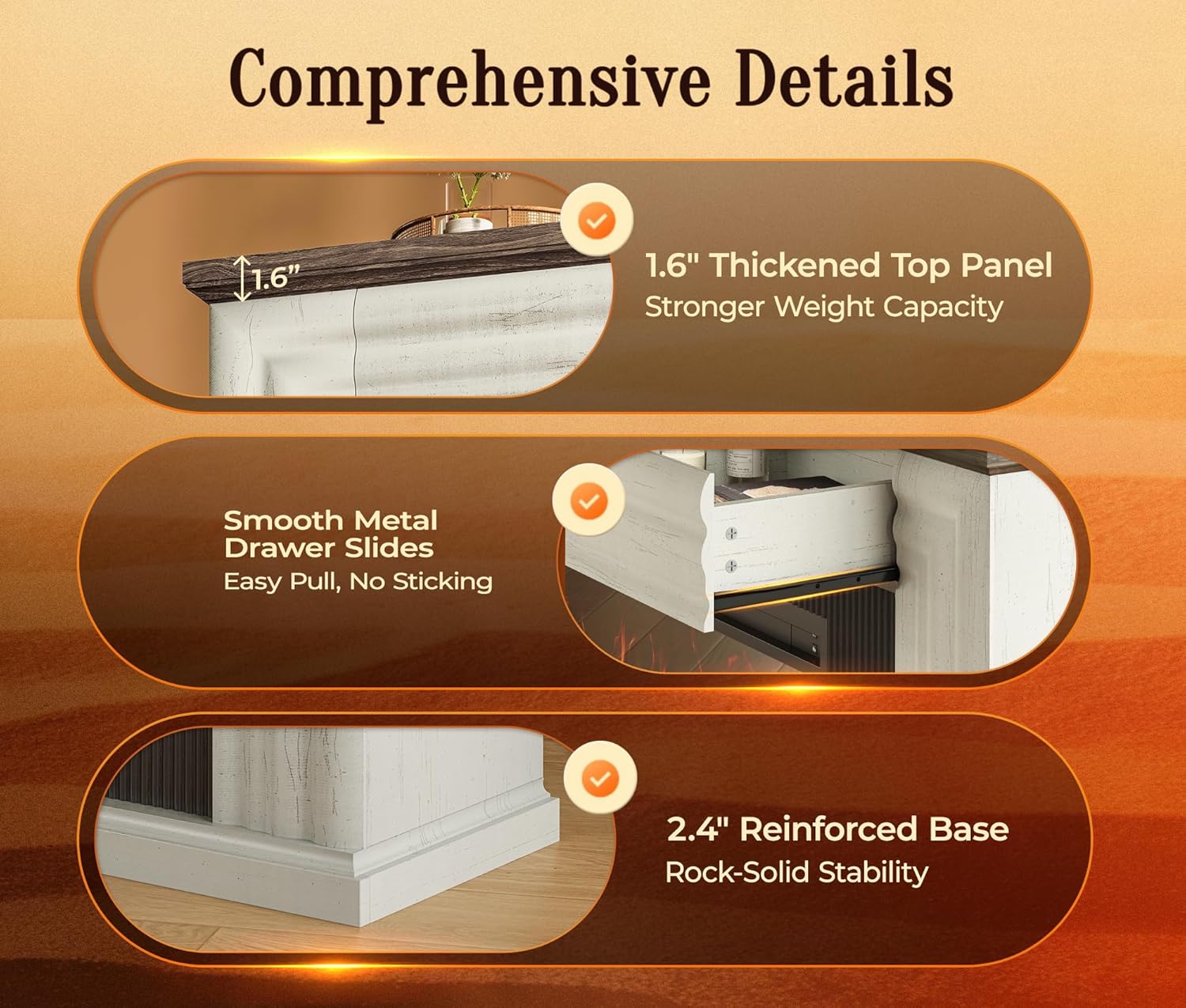 3 Storage Drawers 3 smooth-gliding drawers mean no more hunting for misplaced remotes, chargers, or keys. Keep your living space organized and your mind at ease, with plenty of tabletop space of the TV entertainment center left for dcor, photos, or your favorite plants