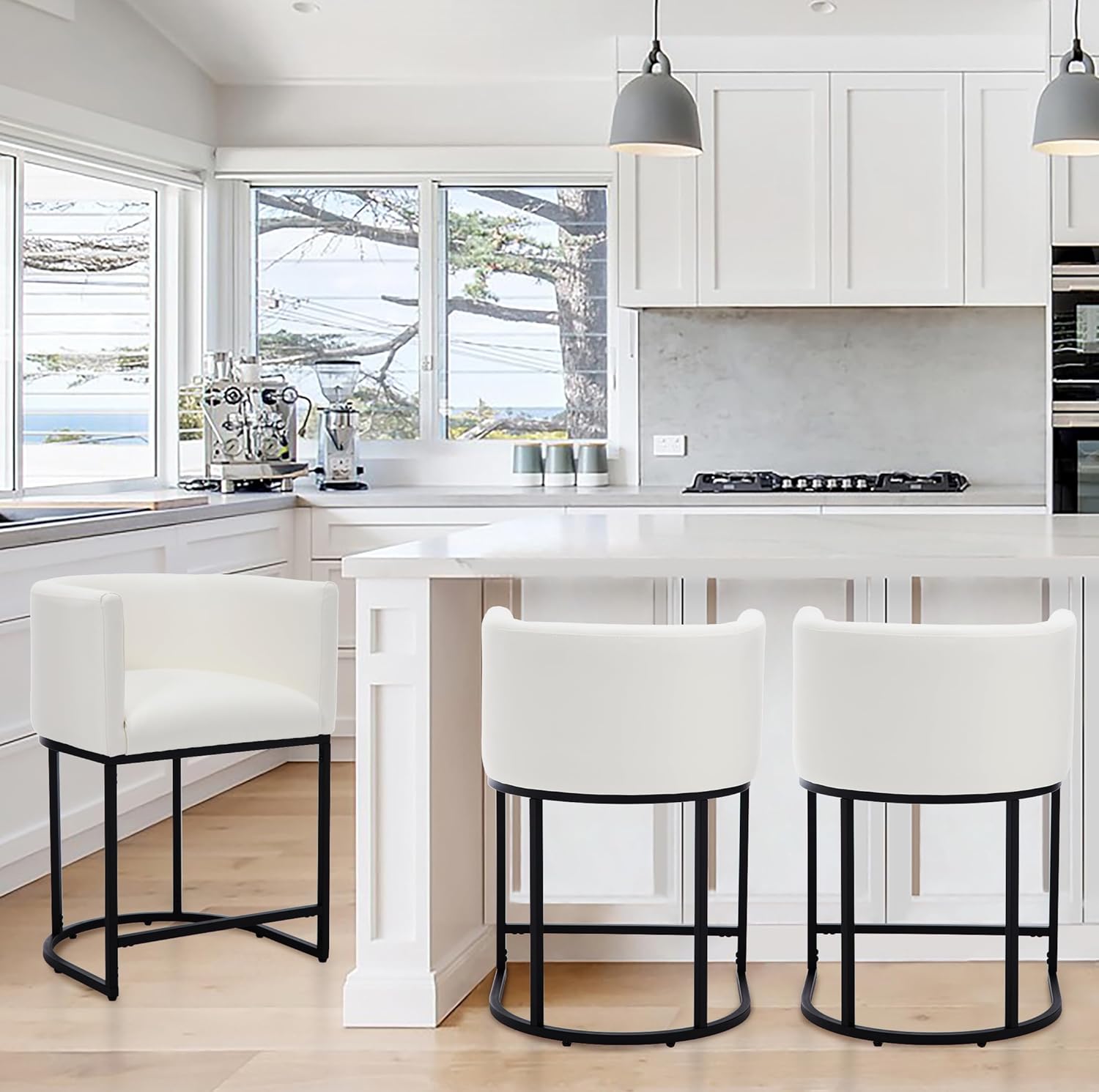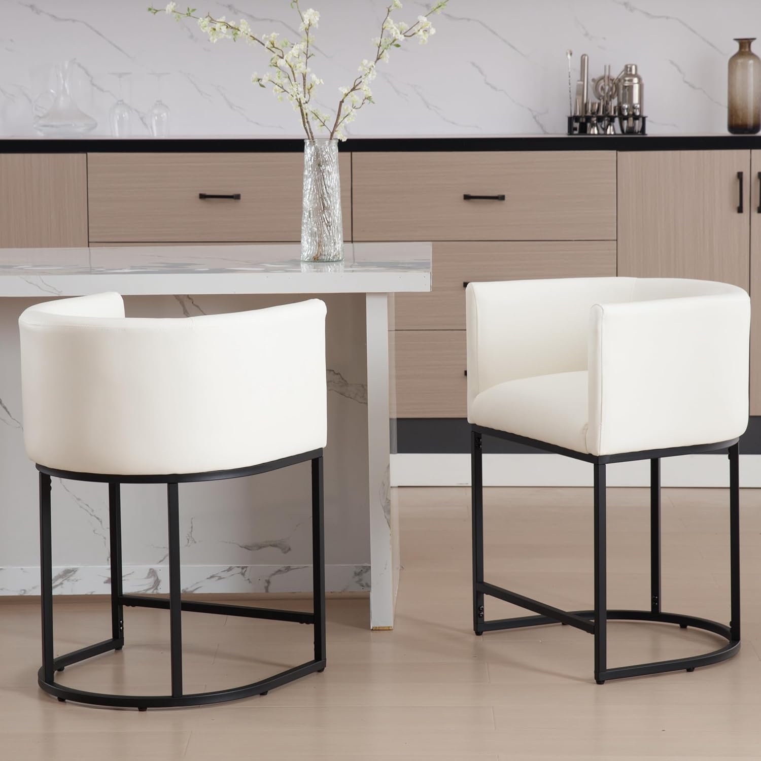 • PU Leather Bar Stools Set of 3, Modern Upholstered Counter Height Bar stools 24" Leather Barstools Barrel Kitchen Counter Island Stools with Black Metal Base, White
