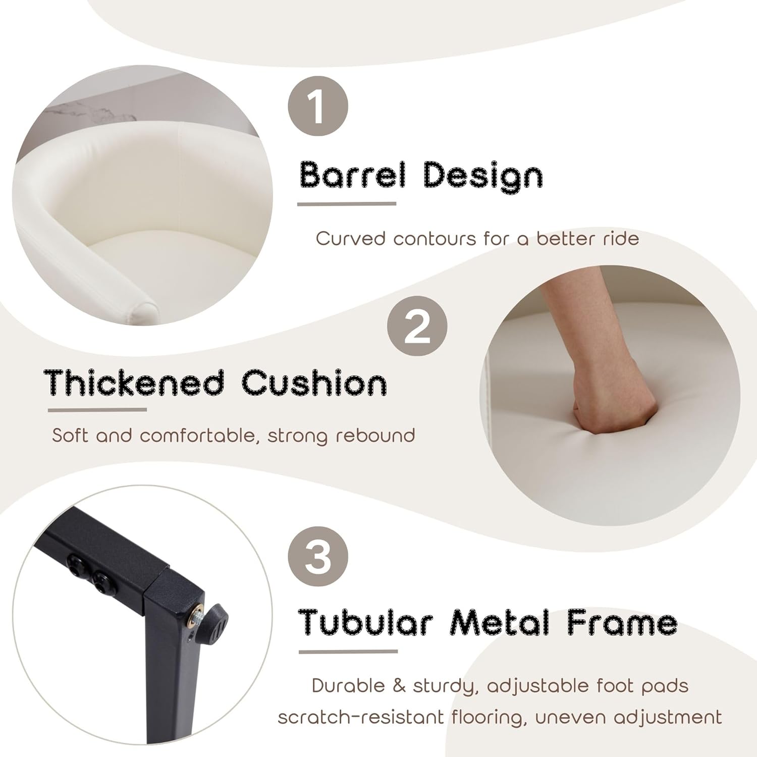 DURABLE FABRICSeat upholstery fabric is made of comfortable pu leather, skin-friendly and comfortable. Waterproof and easy to clean. Seat and back are generously padded with dense high-resiliency foam. Barrel seat cushion wraps around your body, providing a better ride.