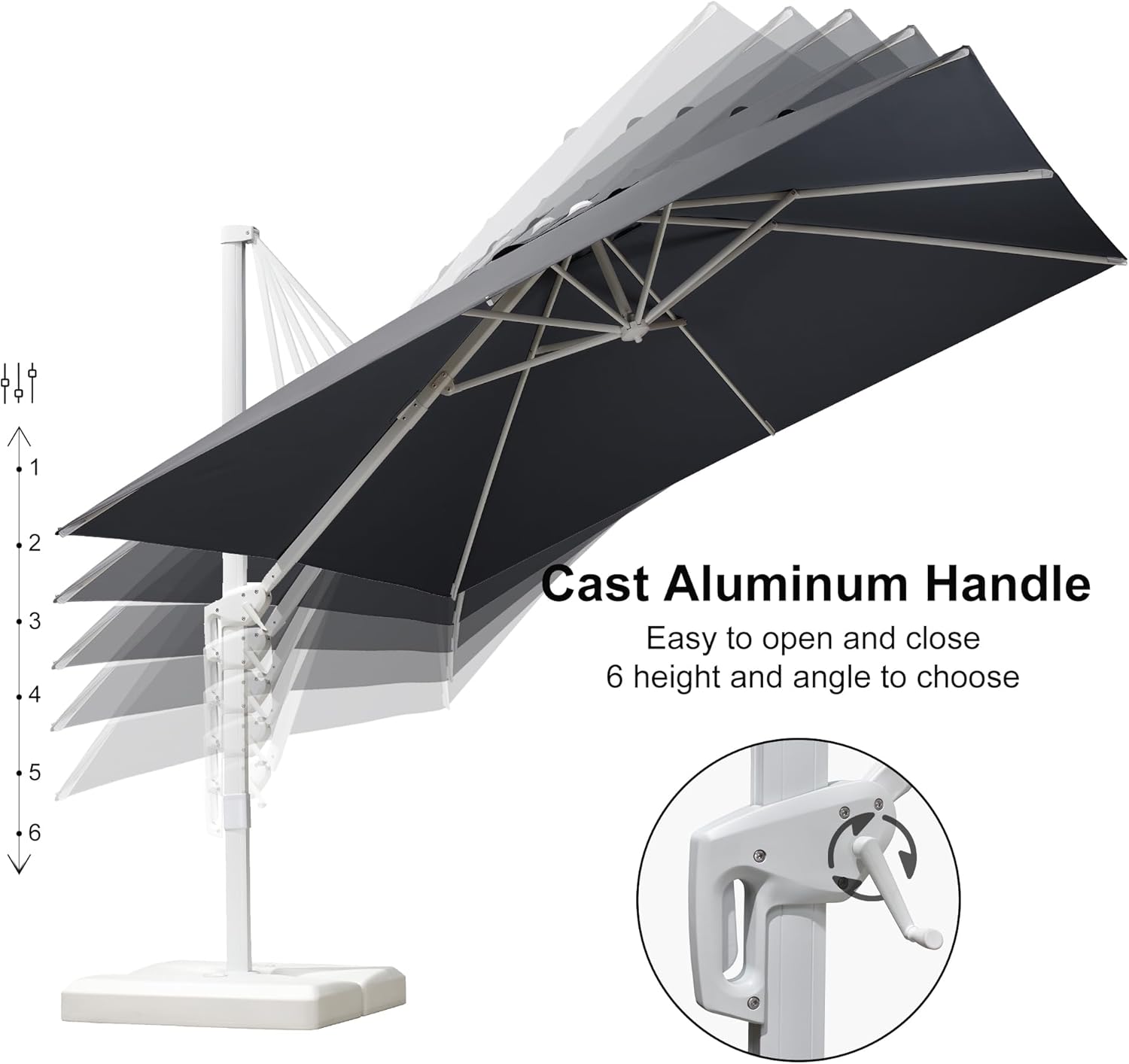 Rotation & Tilt: The crank system of the patio umbrella enables easy adjustment of the canopy height and angle; simply press the foot pedal and twist the pole to rotate the umbrella 360 horizontally