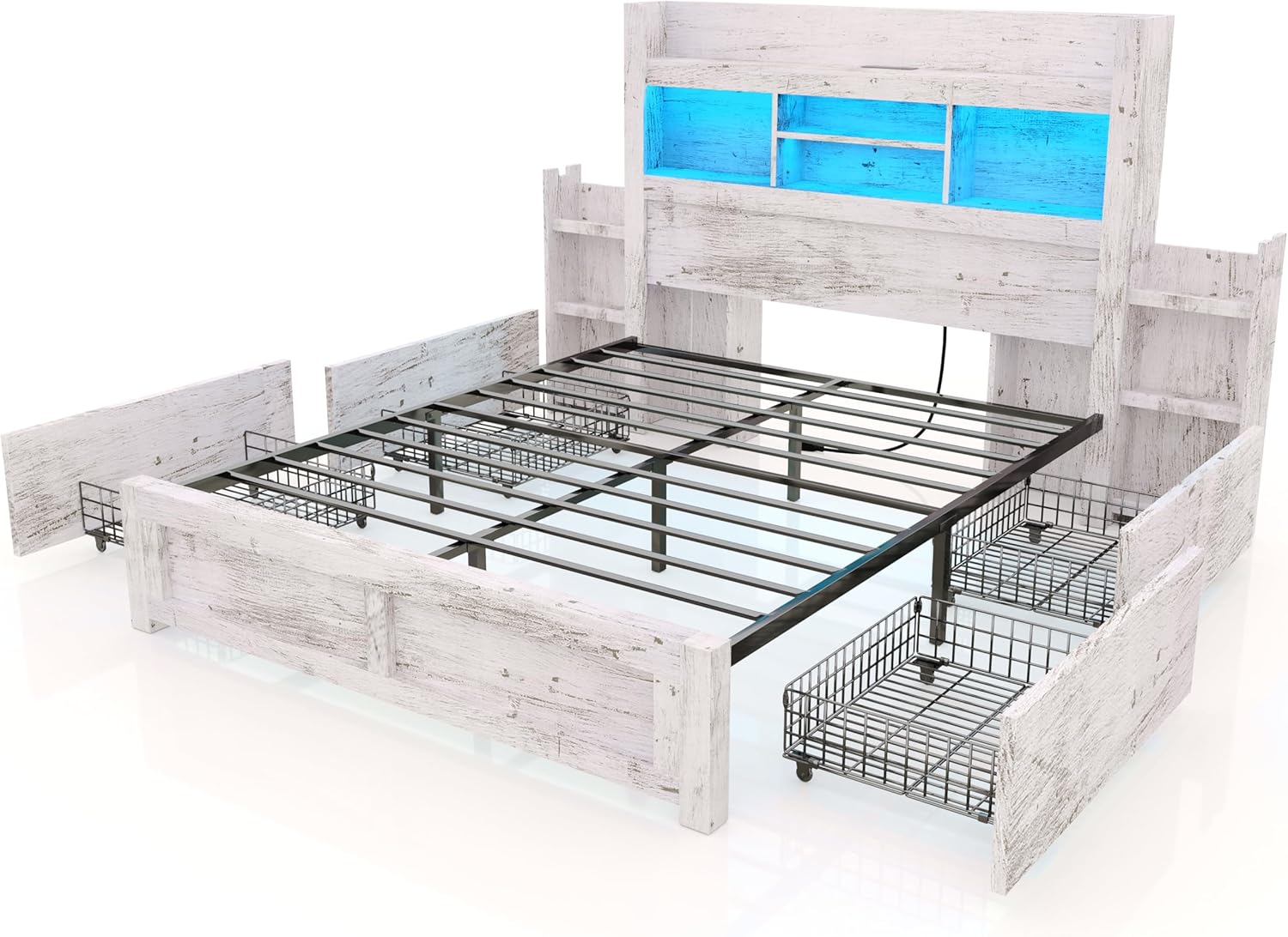 • Queen Bed Frame with 49.6" Bookcase Headboard & 4 Drawers & 2 Detachable Bedside Stoage Racks, Farmhouse Wood Bed Frame with RGB LED & Charging Station, No Box Spring Needed, Distressed White