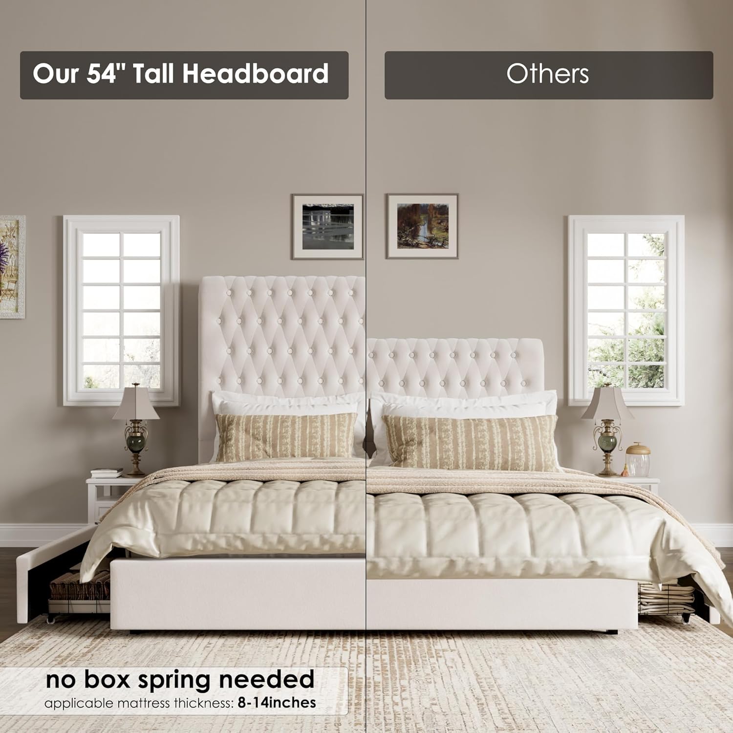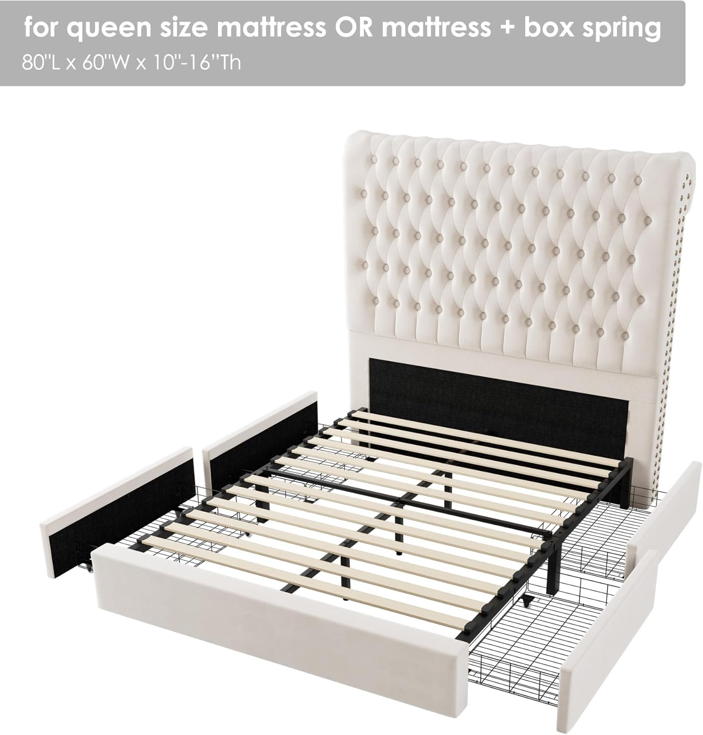 Tufted upholstered bed frame: The bed frame is upholstered in velvet fabric to add softness and comfort. Moreover, the headboard is amply cushioned, providing plush comfort when you are sitting up in bed. This bed is a elegant combination of crisp modern lines and soft button tufting. Gorgeous tufting plus the rivet rolled-edge enhance a modern style.