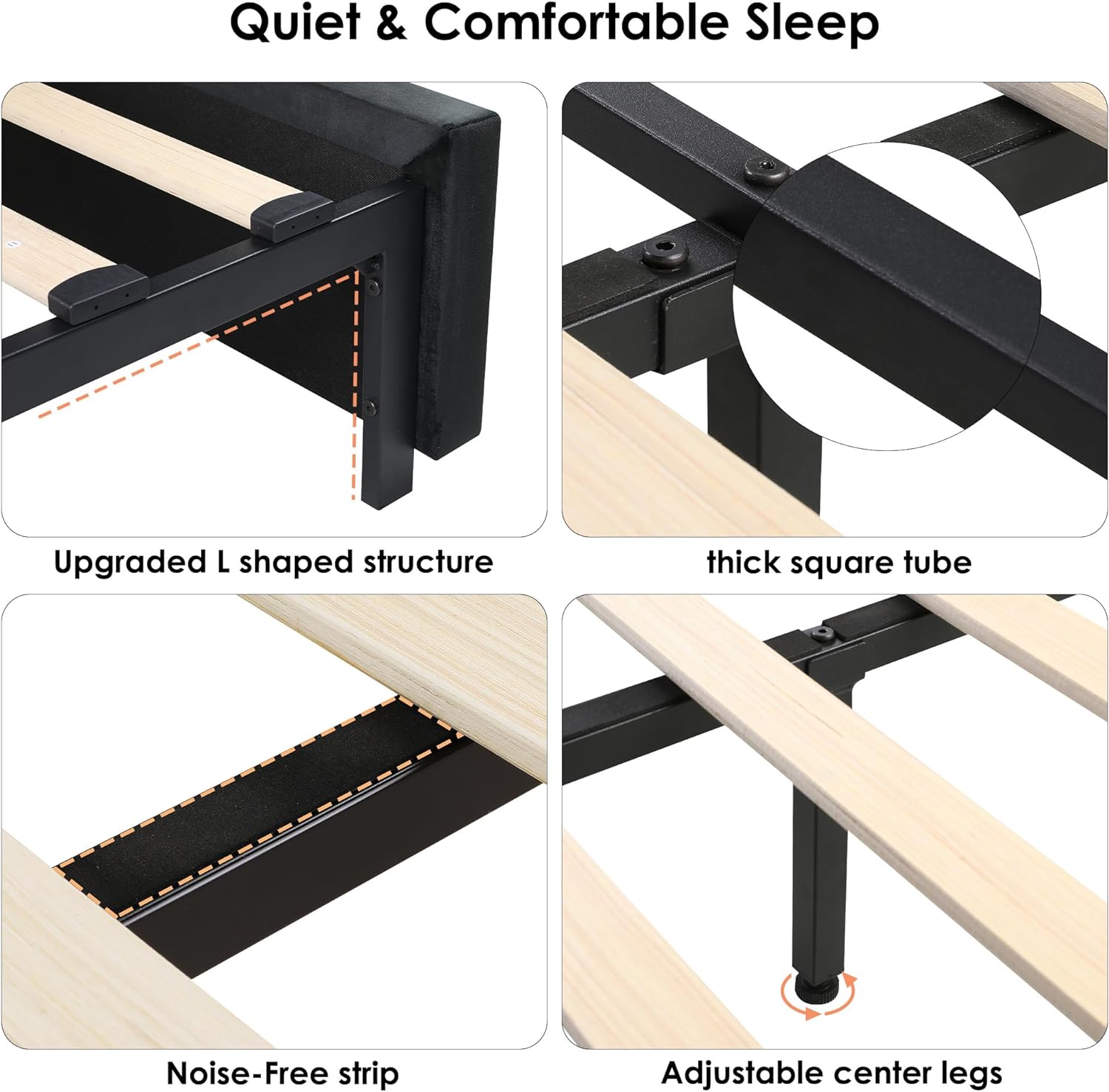 Sturdy platform bed frame: This platform bed features frame constructed from metal and solid wood materials. Whats more is that the platform bed frame is forged from L shaped legs at the bottom, 55mm thickness footboard and hard center tube. Solid wood slats lay the foundation for your mattress, so the bed frame can be used with or without a box spring.