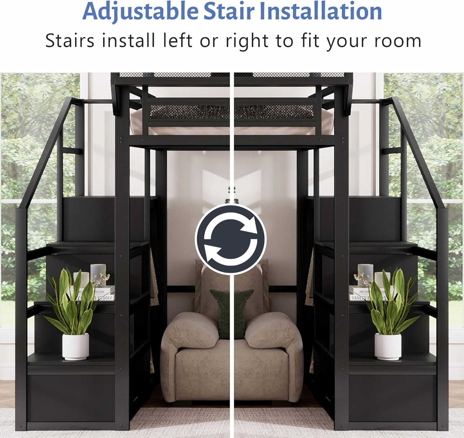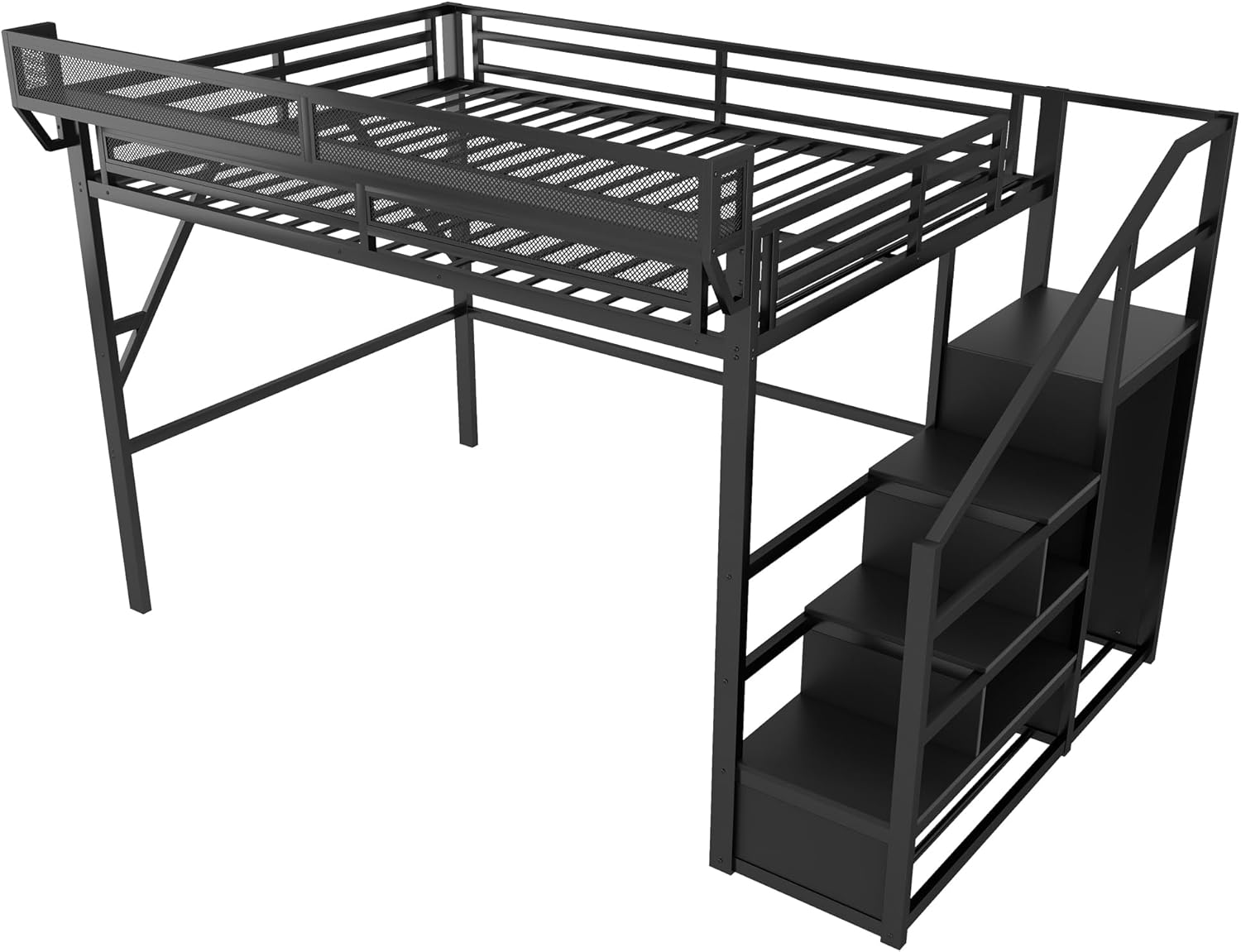 Space-Saving Loft Bed & Workspace:Our queen size loft bed with stairs is built with a comfortable sleeping space with a spacious and useful workstation and bookshelf underneath. With this collection, you can turn space into a workstation, a reading book or a craft area.The area below the bed can be used to study, lounge, play and even store belongings.Ideal for space saving needs.