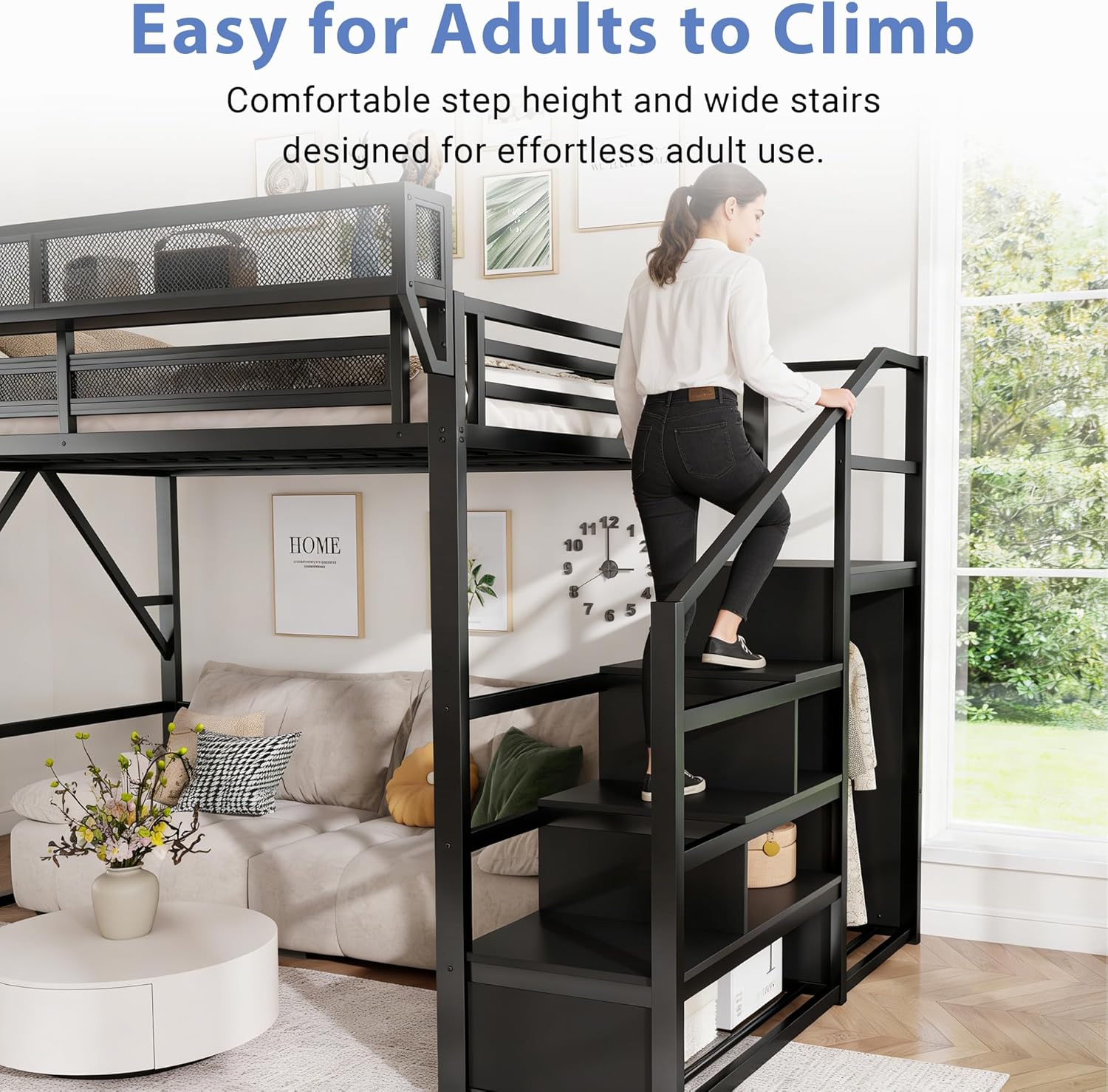 Stylish and IndustrialThis queen loft bed with storage is made of strong metal and rustic style wood grain board, durable and sturdy metal frame designed with a clean-cut silhouette in a modern industrial design. The stylish and simple style makes this queen loft bed fit for any home dcor.