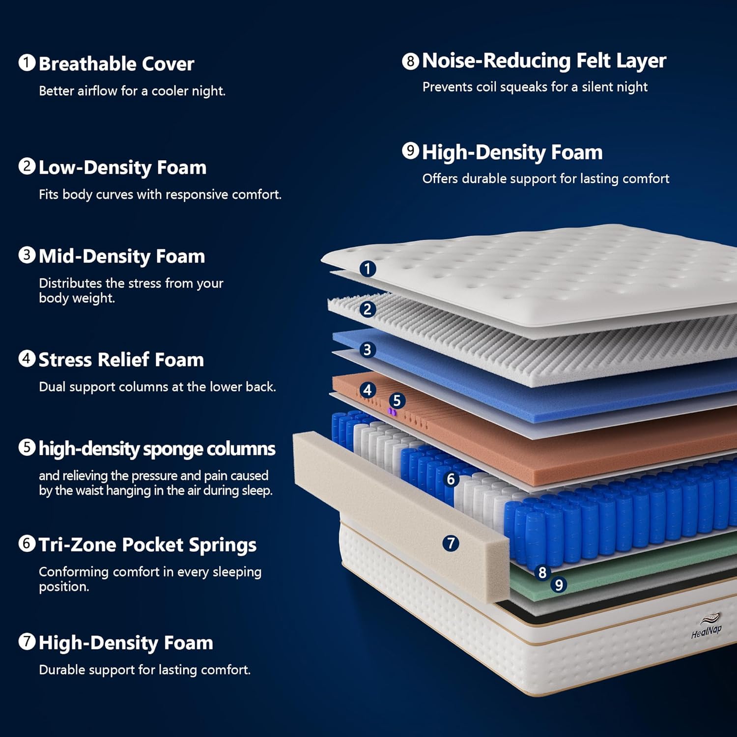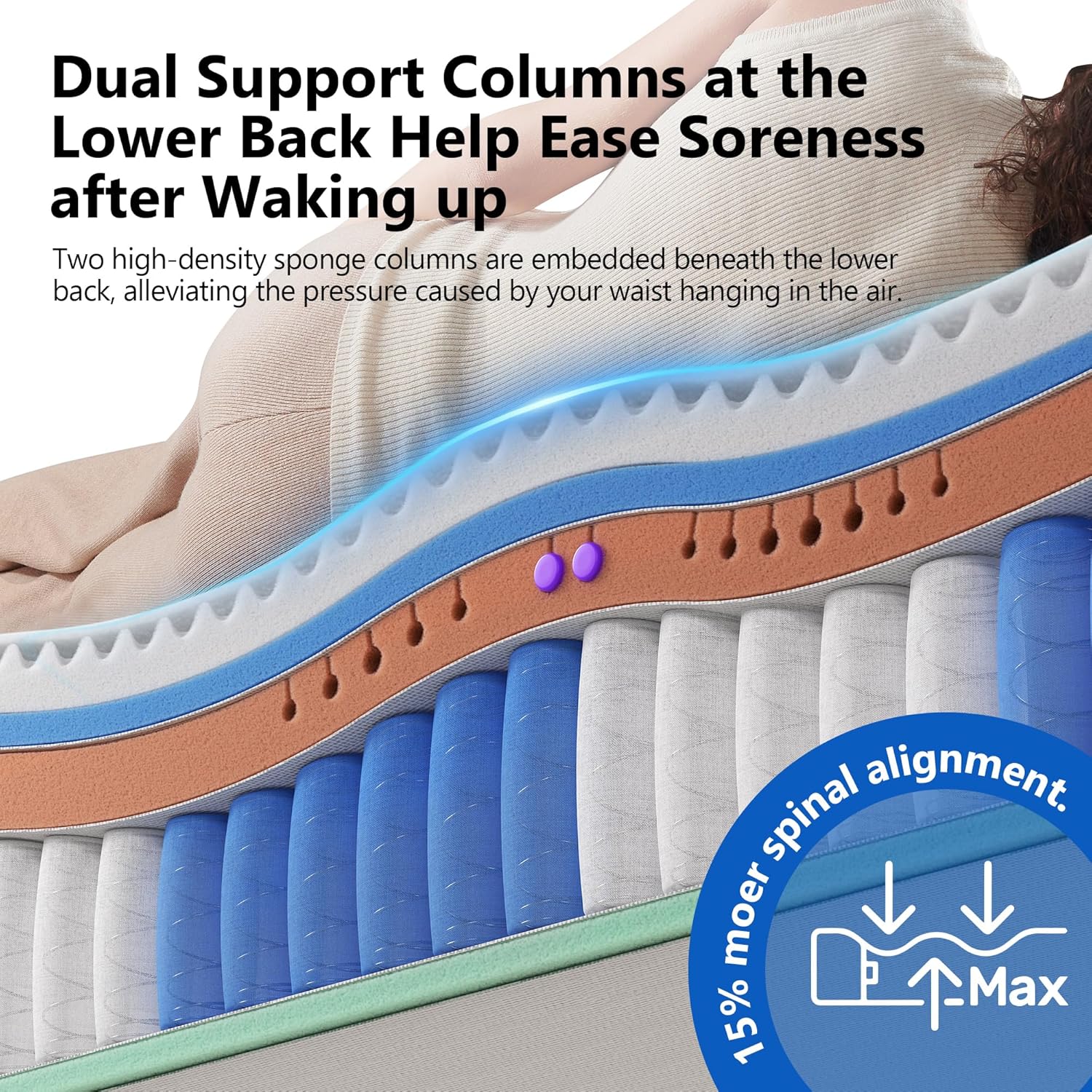 High-Compression CoilsTwo high-density foam pillars are specially added at the hips and lower backtwo key pressure pointsto provide enhanced lumbar and hip support.