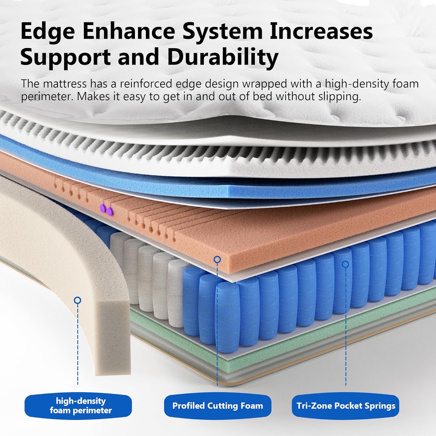 The sides of the mattress are reinforced with thicker, firmer perimeter foam, significantly improving edge support and preventing collapse even under heavy pressure.