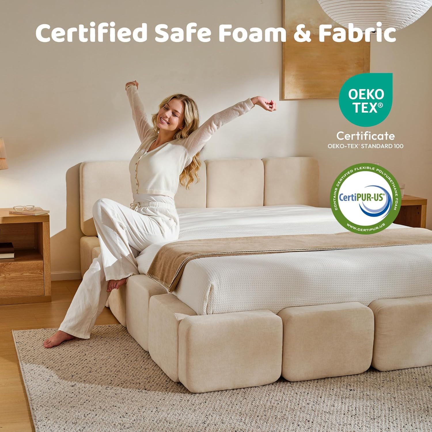 Certified, Safe Materials & CARB-Compliant Wood: This king bed frame with headboard is crafted with OEKO-TEX certified brushed cotton and CARB-compliant solid wood, offering a non-toxic, skin-friendly, and durable sleeping environment
