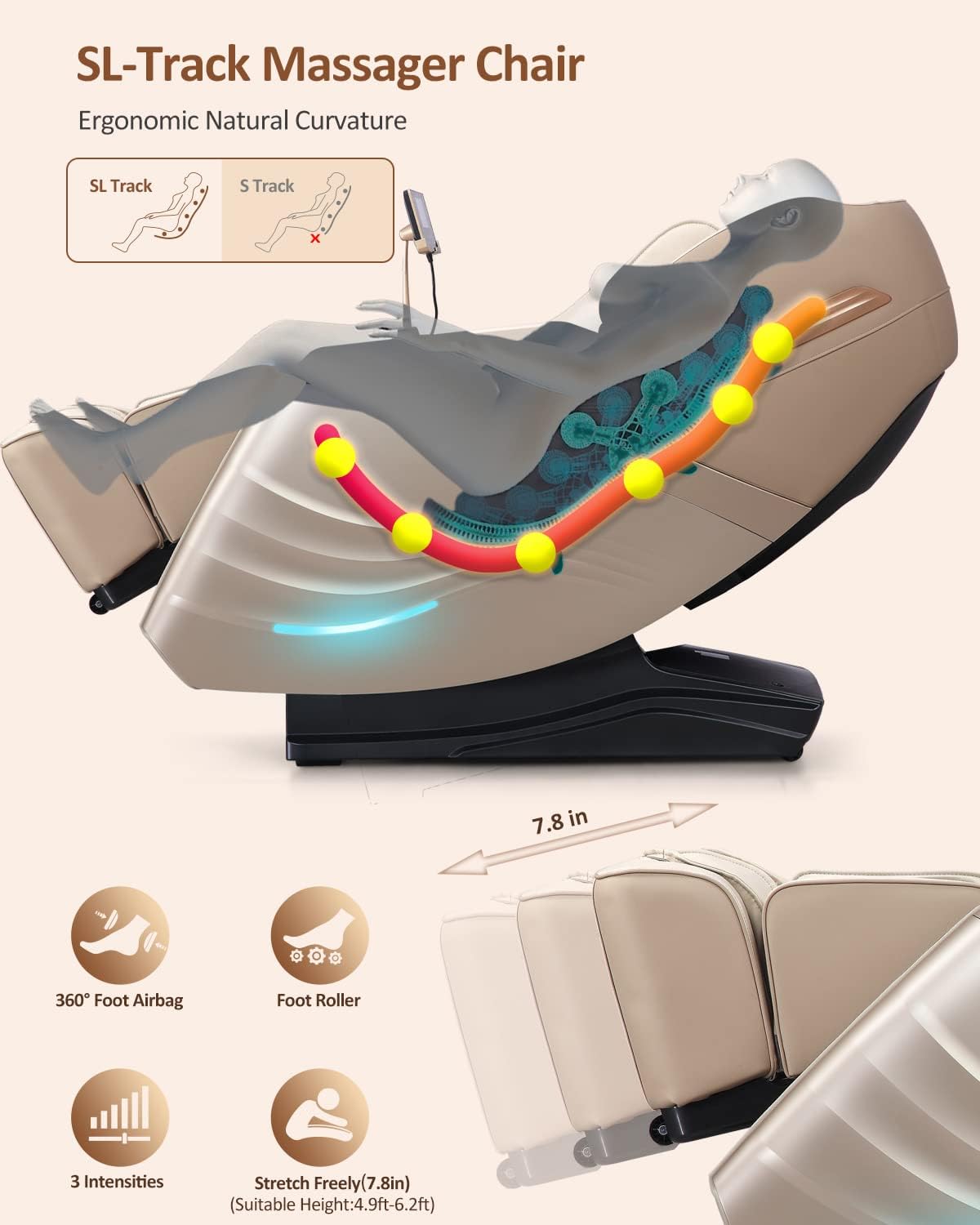 Foot Rollers Massage & Yoga StretchingOur , - combines full-roller kneading on the feet stimulates acupoints and airbag pressure massage on your legs to relieve soreness, offering relaxation from toes to heels. The backrest of the massage chair provides yoga-style stretching to ease lower back discomfort and relax tired legs, realizes yoga-style stretching, helping you feel refreshed and comfortable after a long day.