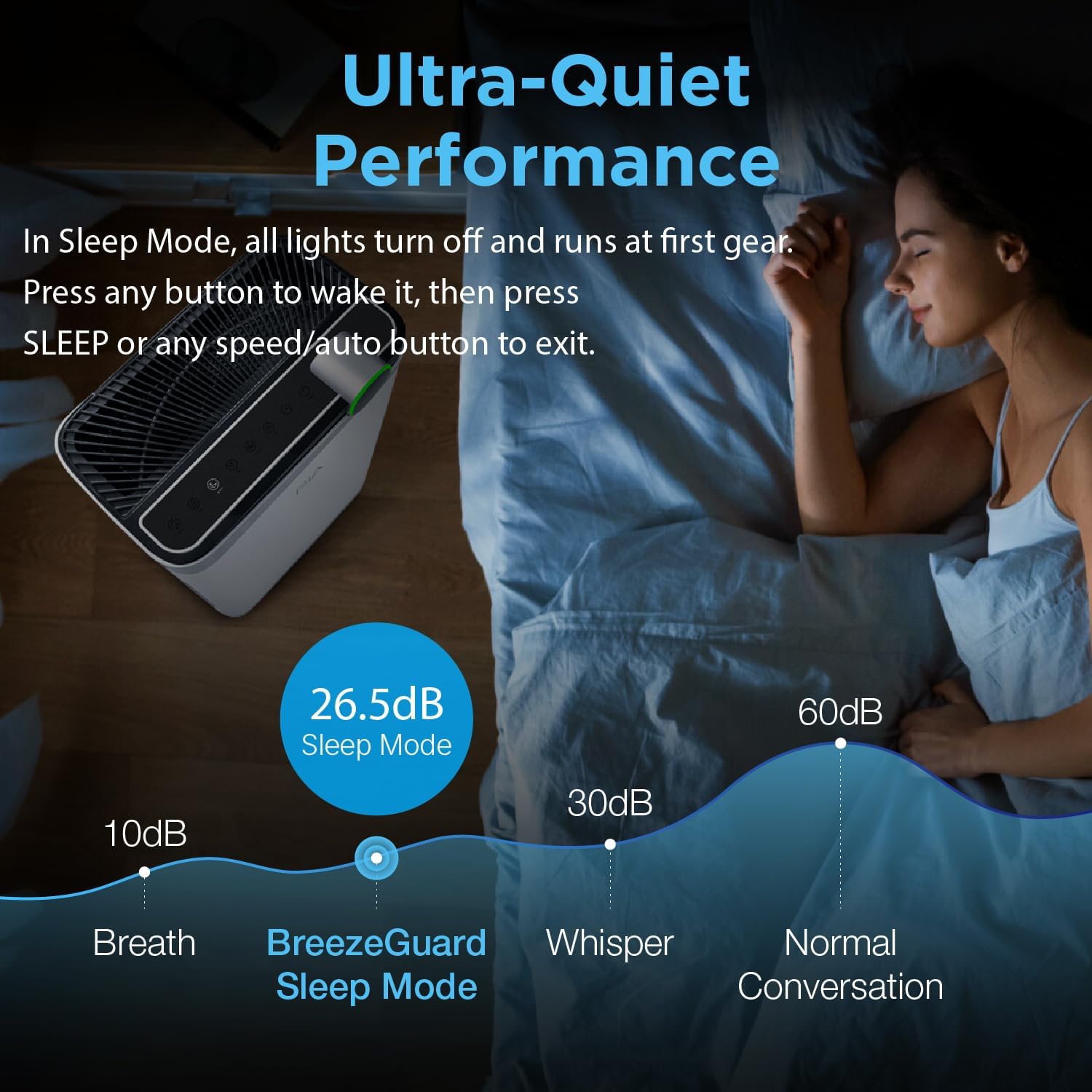 Odor Elimination & Allergy Relief: The BreezeGuard effectively neutralizes household odors such as cooking smells, smoke, and pet litter box scents. Combined with HEPA air purifier filtration, it reduces airborne allergens, supporting easier breathing and better sleep quality for sensitive users and families with children.