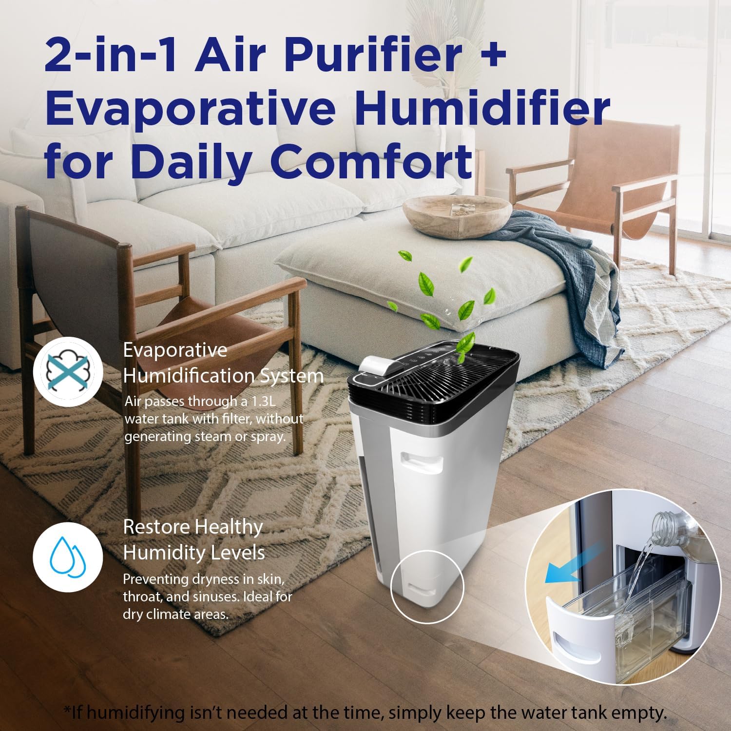 Pure Air, Gentle Moisture All in One Smart Design : Enjoy cleaner air and natural comfort in one sleek device. Designed for modern homes, BreezeGuard is an air purifier first, with a bonus evaporative humidifier function to relieve dryness. Air flows through a 1.3L water tank, adding soft, natural moisture no mist, no steam, just comfort you can feel.