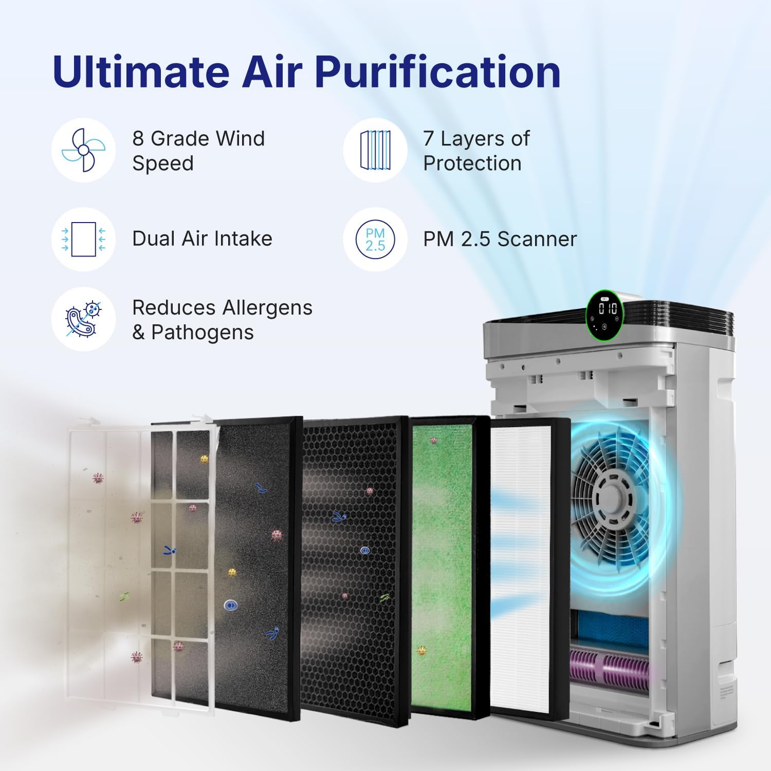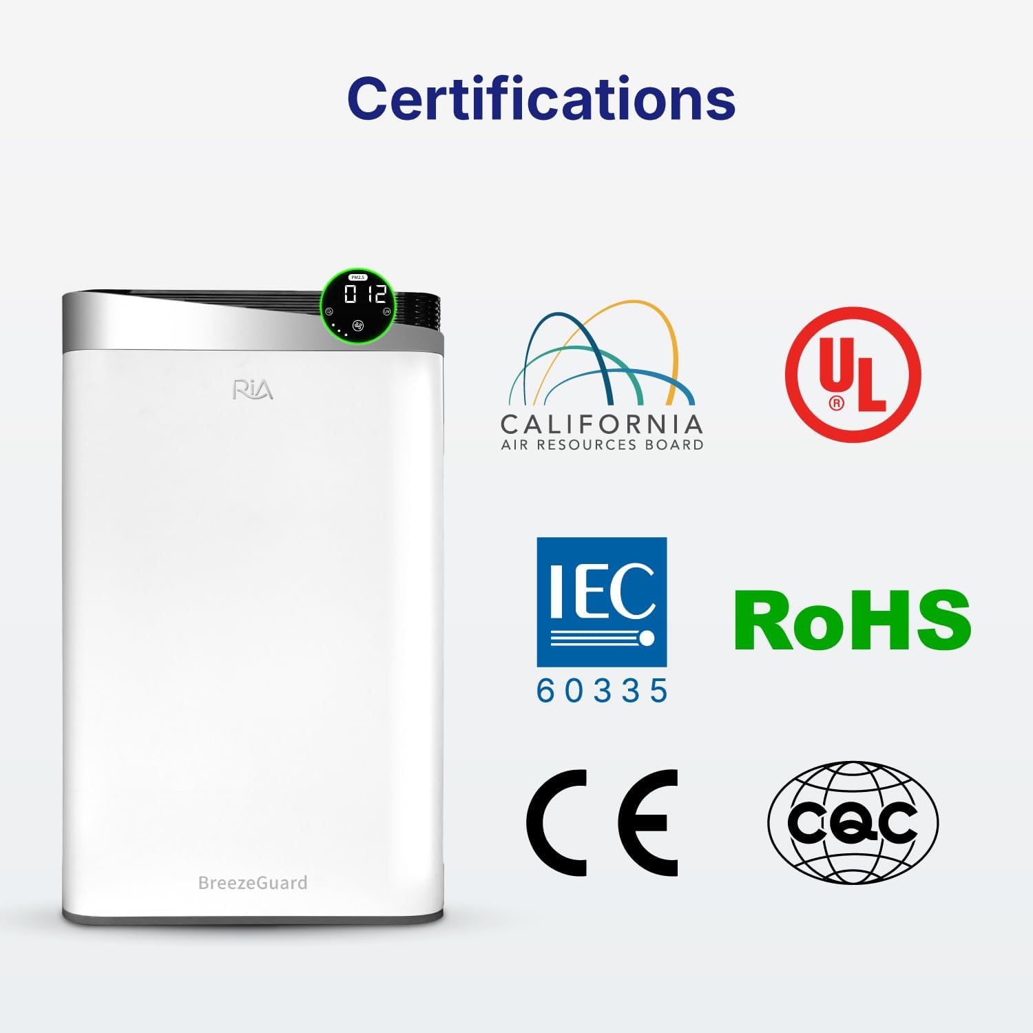 CARB Certified Protection: Tested and safe; Meets ozone emission standards of 0.05 ppm and electrical safety standards; 7-layer filtration targets allergens, pet dander, pathogens, and formaldehyde using Cold Catalyst, Activated Carbon, HEPA 13, UV-C, and Ionizer.