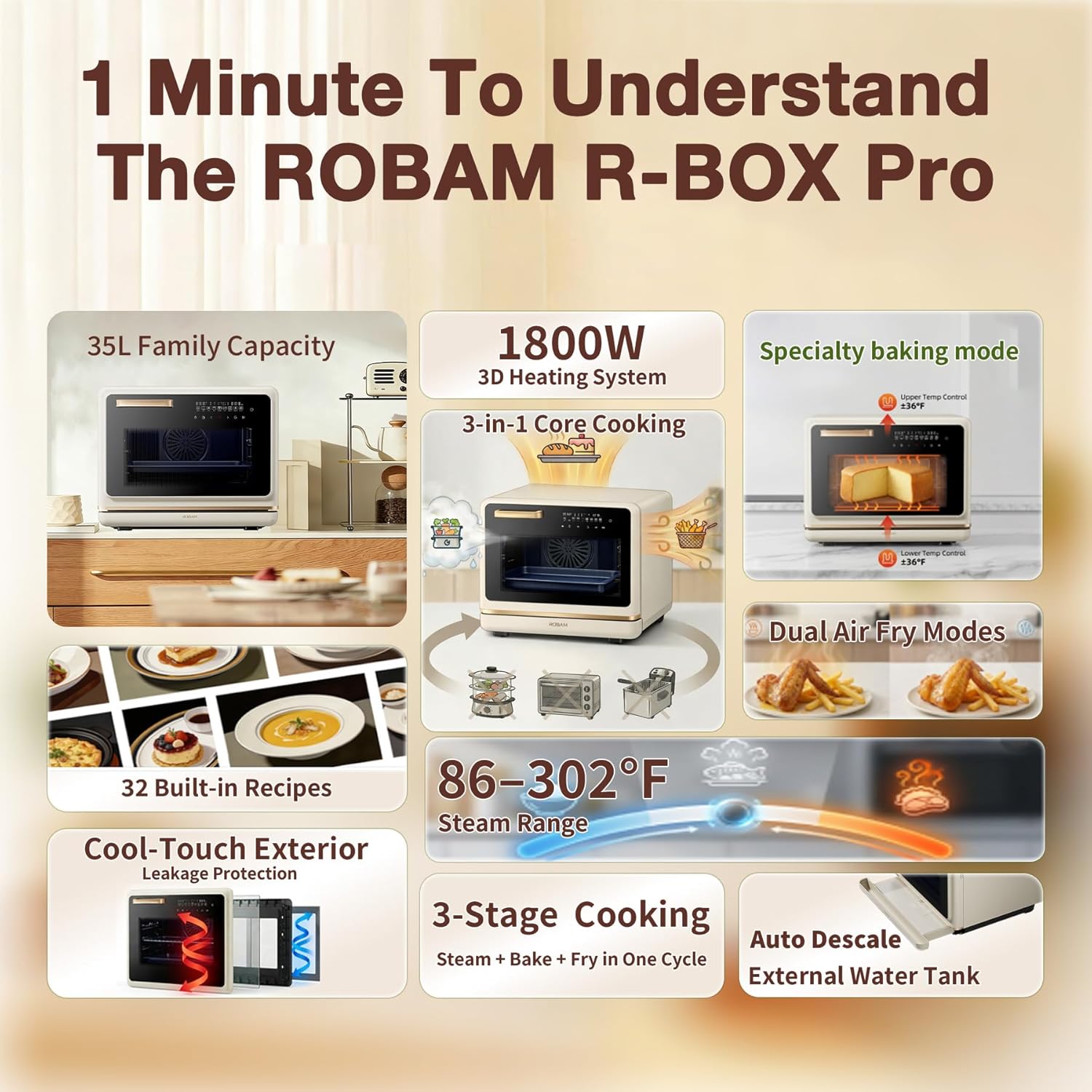 [Best Baking Texture with Multi-Stage Cooking] Features 3-stage cooking programs combining steam + bake + air fry automatically, helping achieve better top browning, juicy interiors, and best crust results for bread and cakes in home baking
