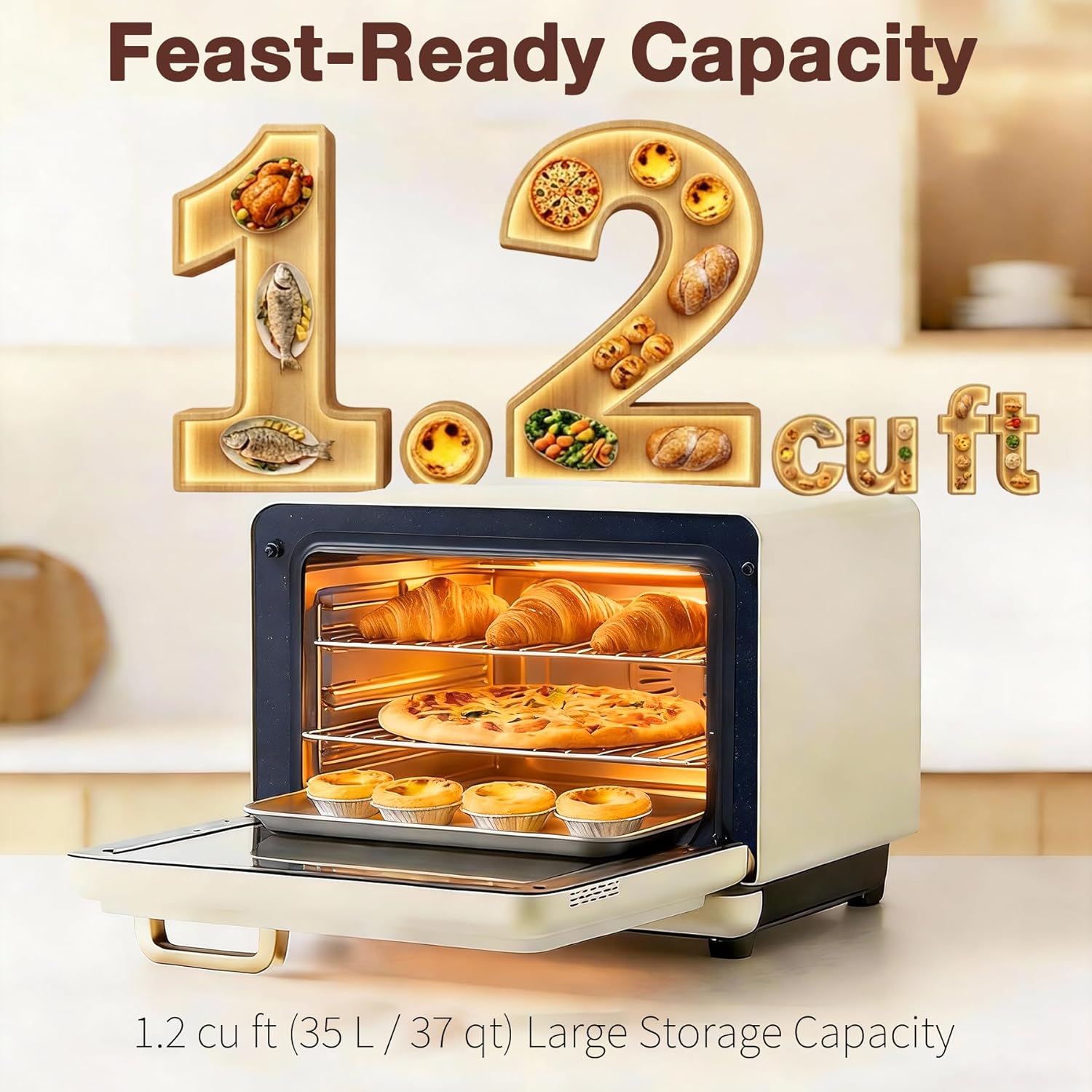 [Large Capacity for Family Meals & Pizza] The large 1.2 cu. ft. (1.1 cu. ft. usable) interior fits multi-layer steam cooking, roasting, and air frying, making it ideal for pizza, baking trays, grill racks, and family-sized portions while saving counter space