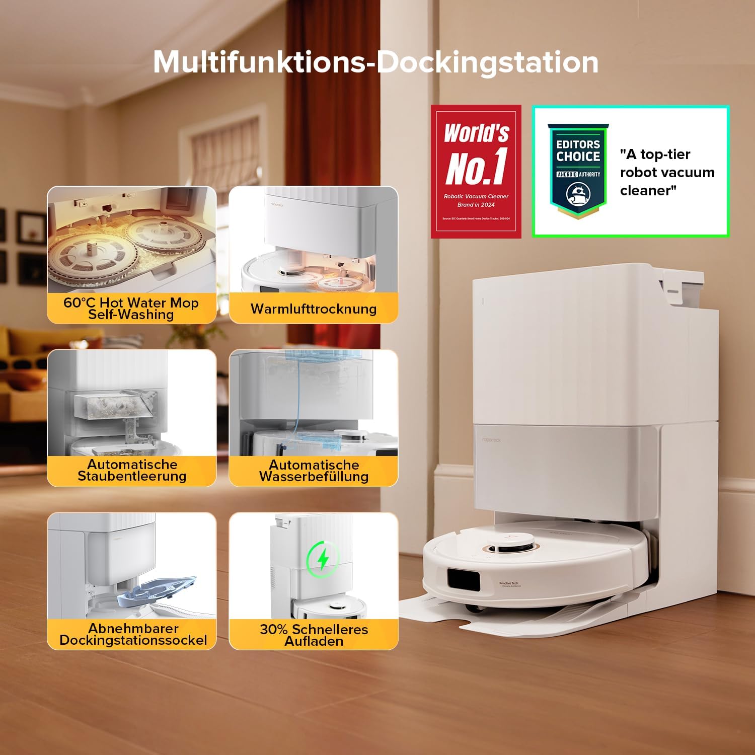 All-in-One Smart Dock with Warm Air Drying Revolutionize hands-free cleaning: auto-empties dust into a 7-week storage bin, self-washes mops, and uses hot air drying to prevent odor. Auto-refills the water tank for uninterrupted mopping across 3,552 sqftperfect for large homes.