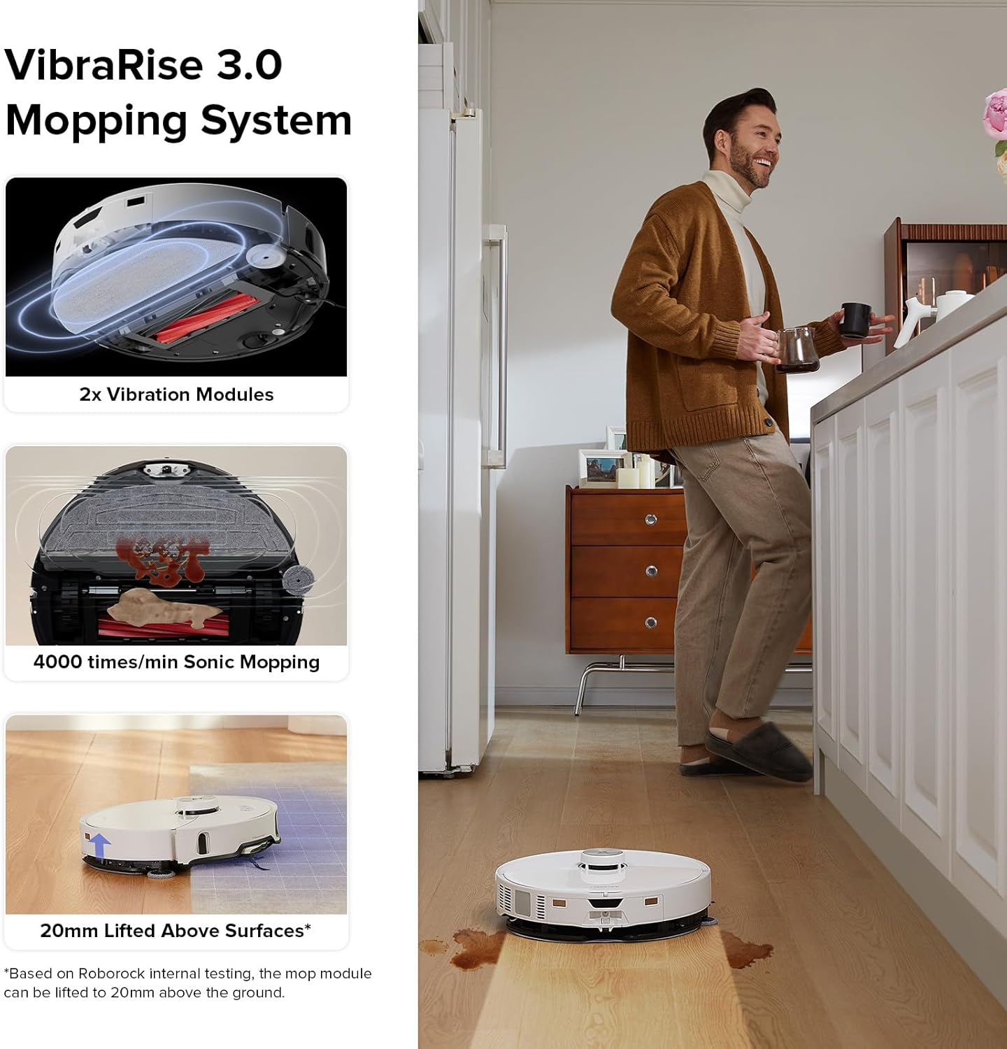 VibraRise 3.0 Mopping System: Featuring double vibration modules, the upgraded mop effortlessly manages dust, dirt, and dried-on stains through its 4000 times/min high-speed scrubbing. It lifts up to 20mm above the ground while cleaning carpets, allowing simultaneous vacuuming and mopping without causing unwanted dampness.