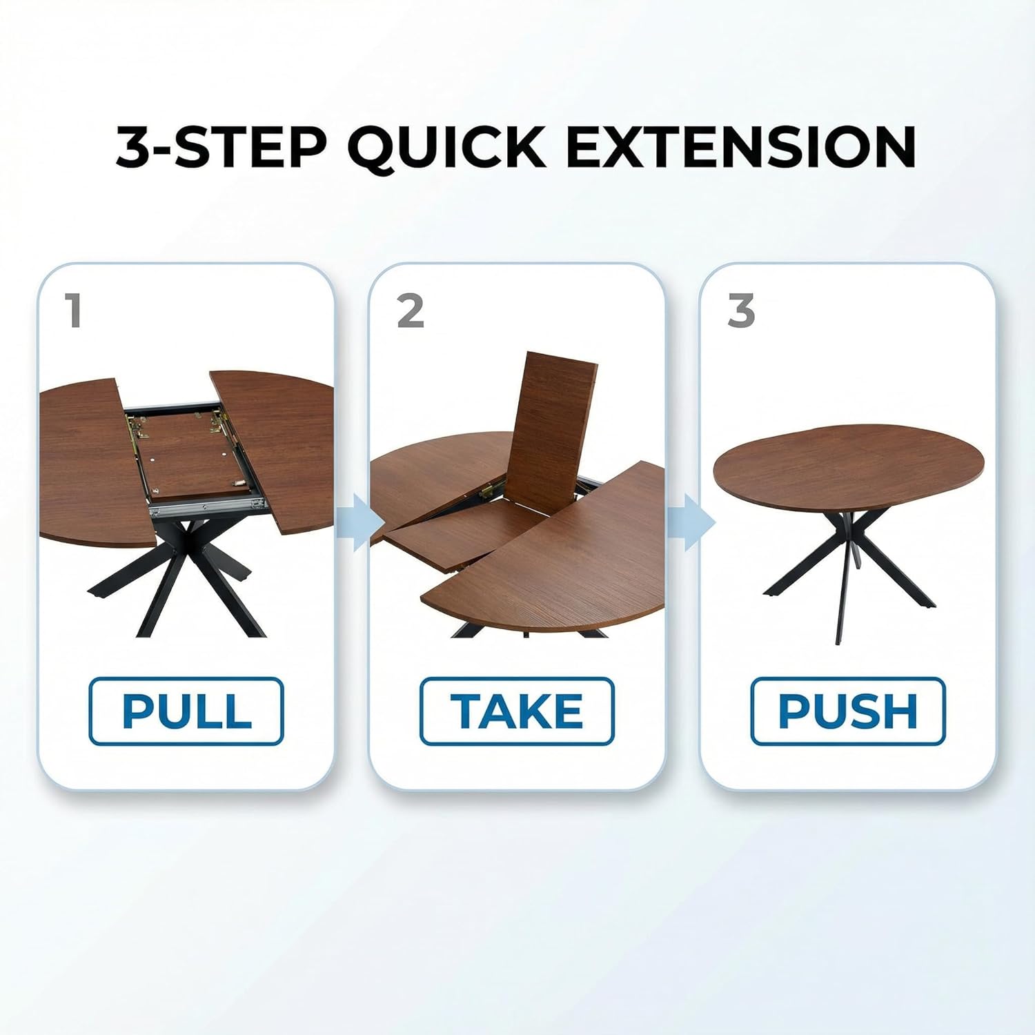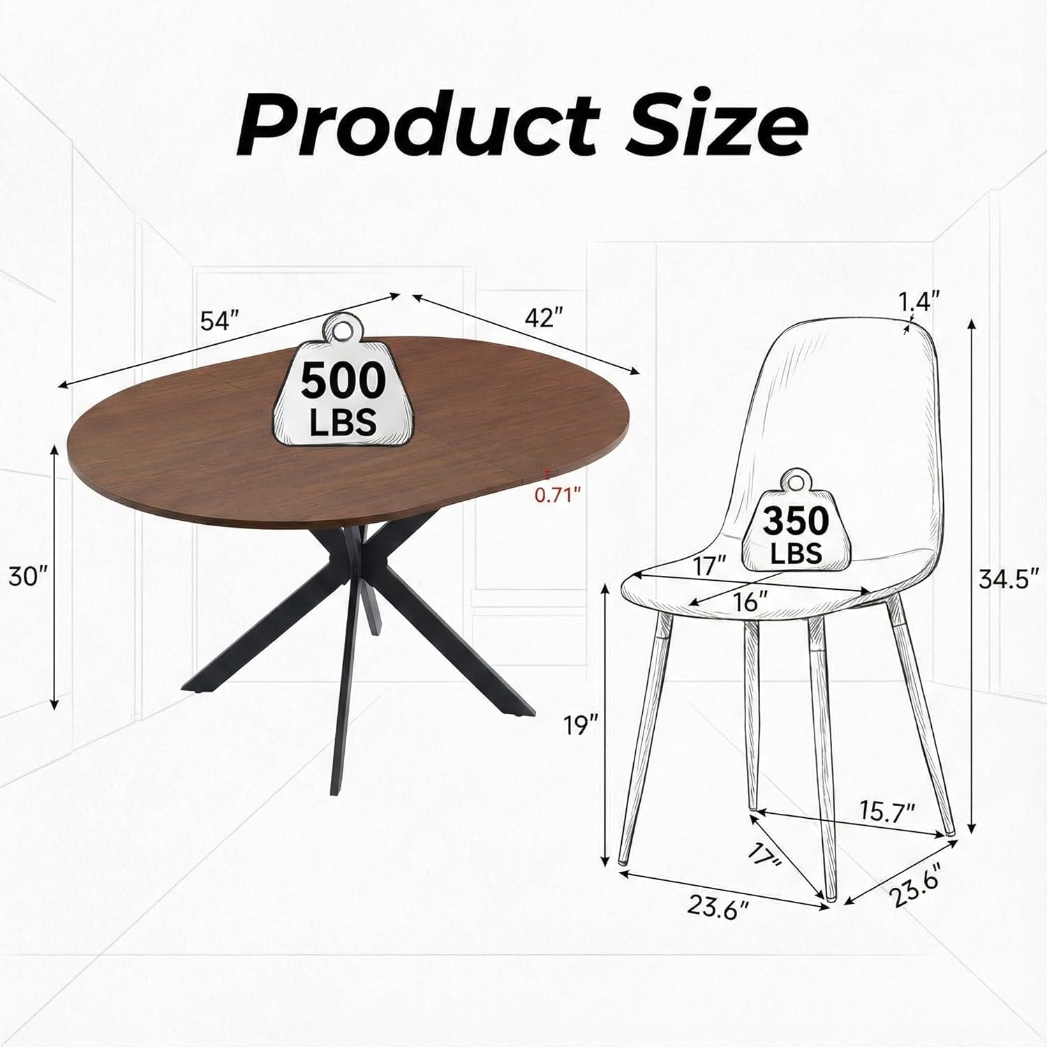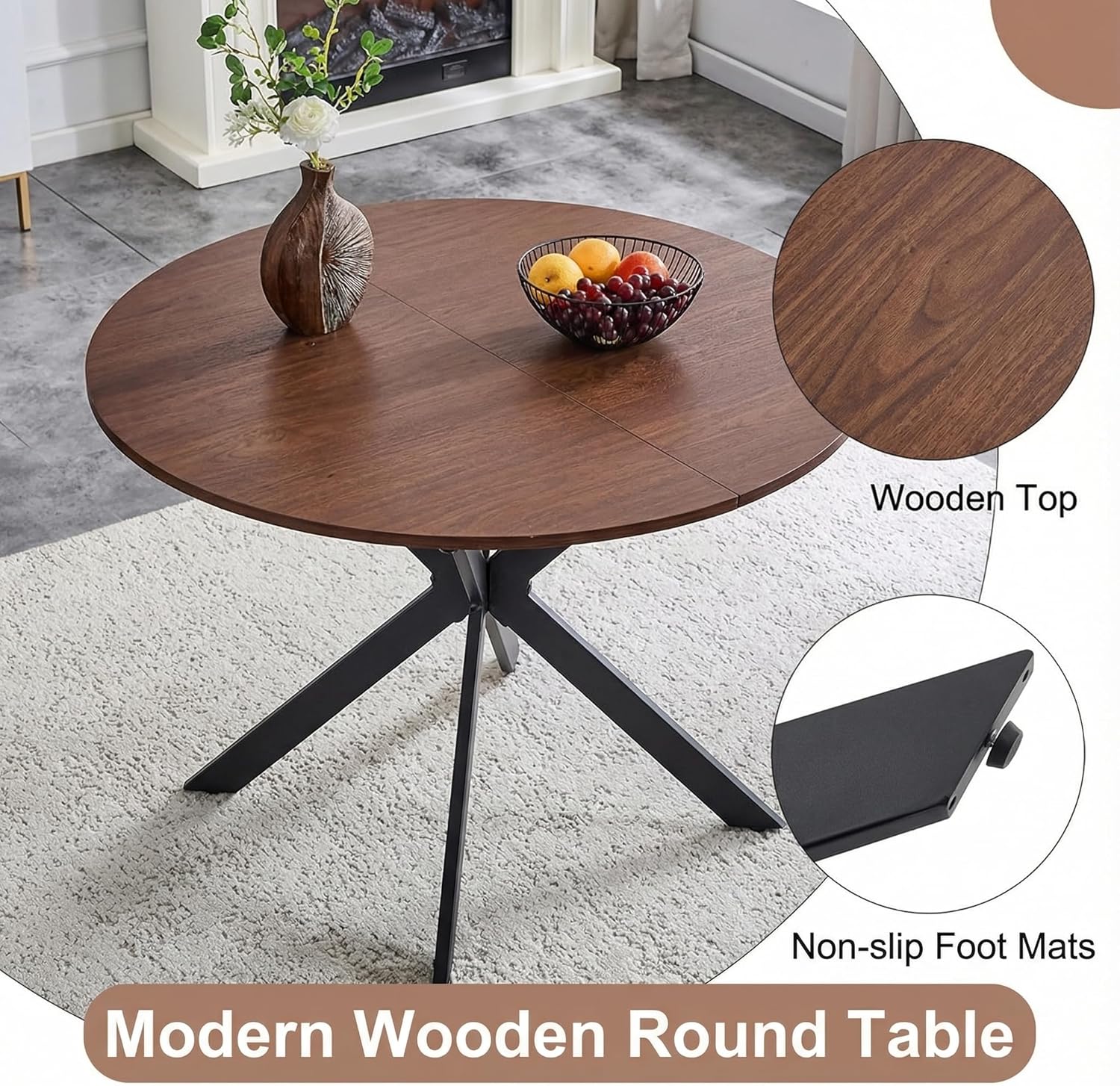 [Extendable Dining Room Table Set for 6] The tabletop for this kitchen table set is made of 0.71" thick wood, and the table can be extended from 42" Round to a 54" oval table. You will find a perfect balance with the adjustable footmat under each tableleg. In order to protect children from injured, the table edge is designed smooth