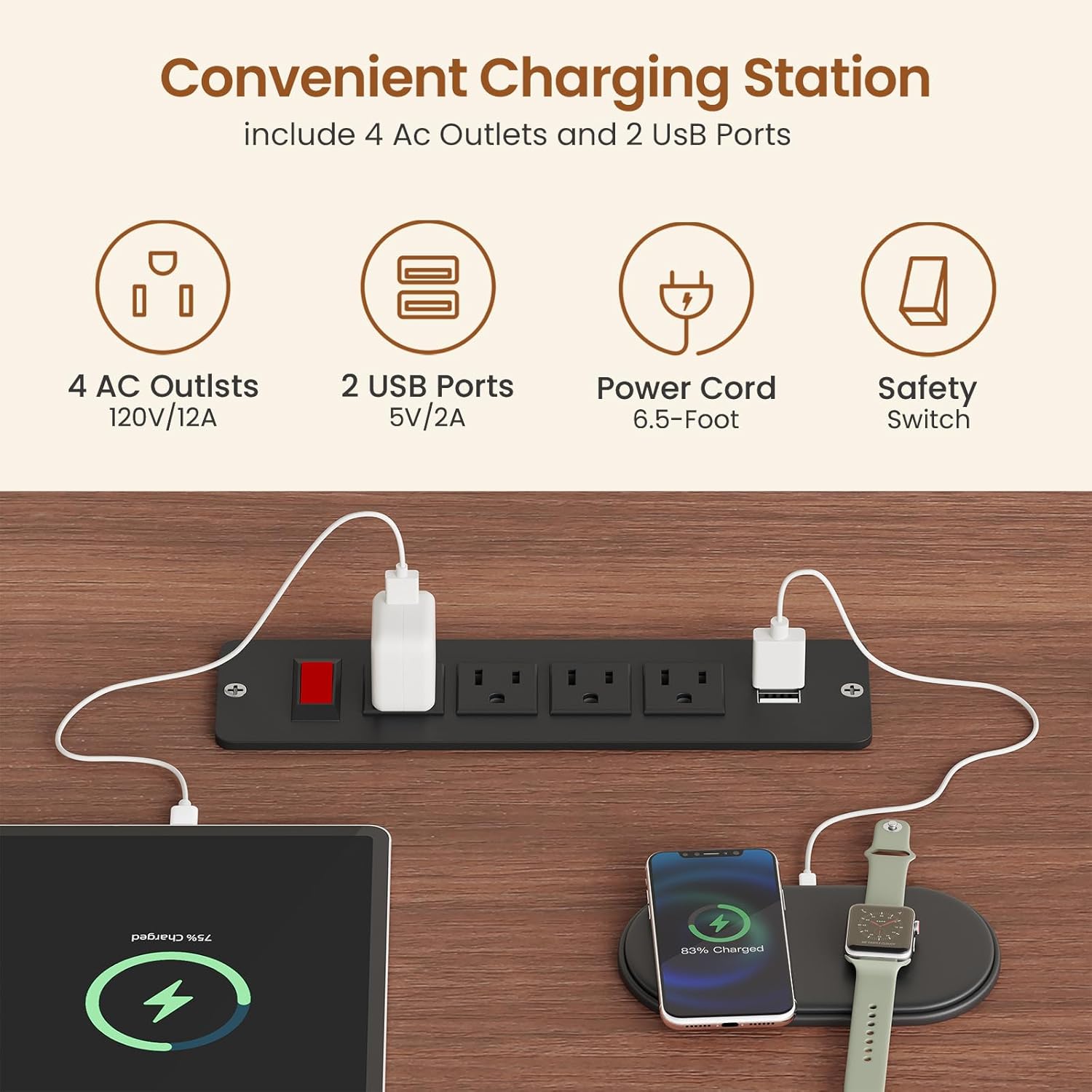 Charging PortOur charging station includes 4-Outlet & 2 USB Ports to provide power for up to 6 devices simultaneously. Power outlet allows you to charge cell phones, tablets, notebooks, etc. This 67 inch l shaped standing desk with drawers offers ample workspace for home offices or gaming accessories.