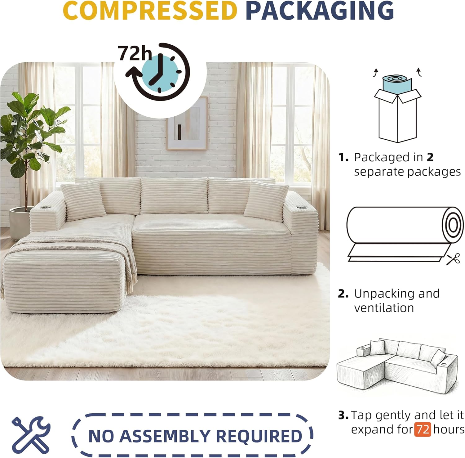 Convenient 2-Box Delivery & No Assembly: This boneless sofa arrives in 2 separate boxes for easier handling. Please note that packages may arrive at different times. The best part? No tools or complicated assembly are required. Simply unbox, gently pat the cushions, and allow 72 hours for the foam to fully expand to its perfect, plush shape.
