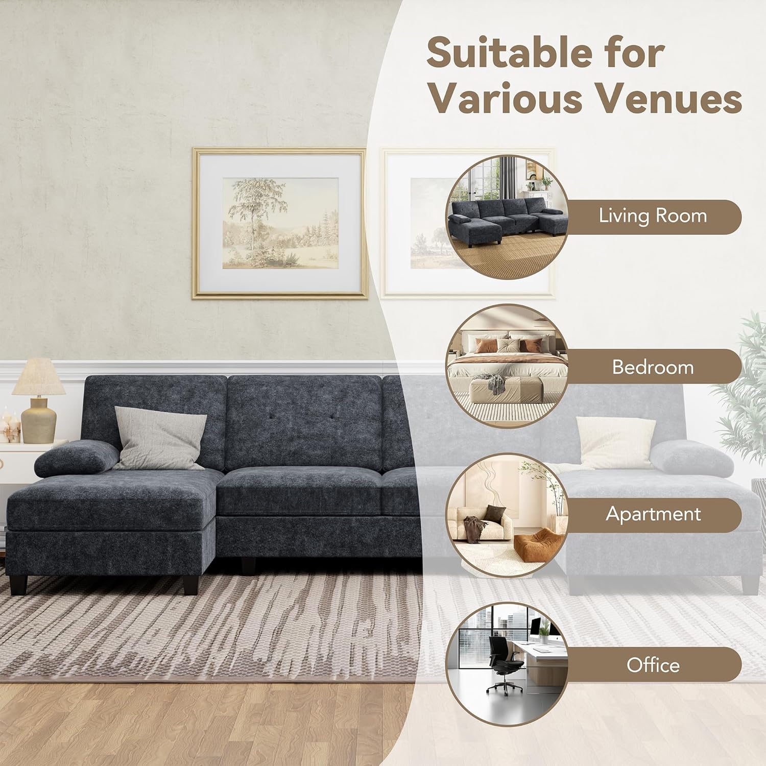 Built to Last: Crafted with a solid wood frame and U-shaped connectors, this sectional couch delivers robust supporteach seat holds up to 300 lbs. Expert craftsmanship ensures lasting durability, plus a stable, noise-free experience for your living room sectional sofa