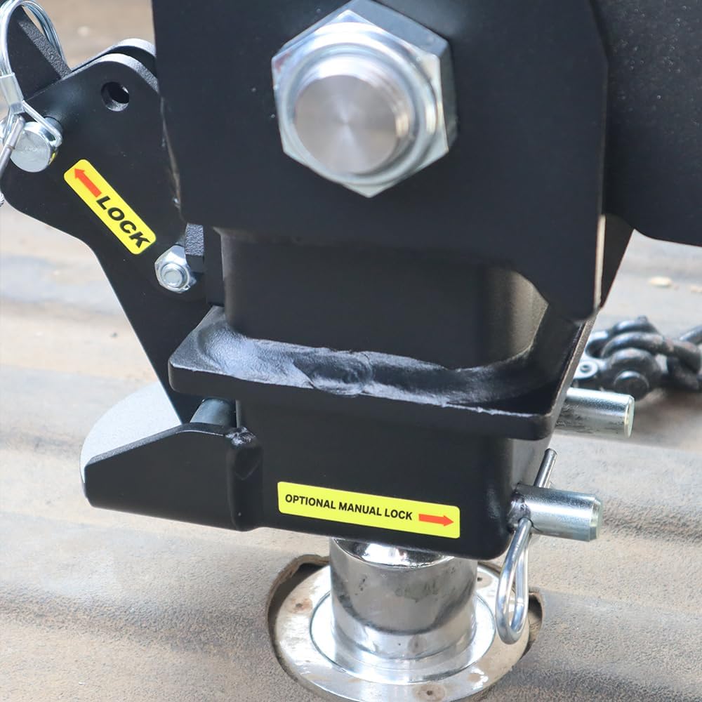 Comes with a patented 30K dual latching Shift Lock coupler for 2-5/16 inch hitch ball & heavy duty thick wall stem options. Extends coupler 9" forward. The only gooseneck coupler that captures ball on both sides. At a glance, you can see if the coupler is locked on ball. Easy to use handle to hook up & disconnect the coupler from the ball. Patent #11,370,257 B1 & additional patents pending.