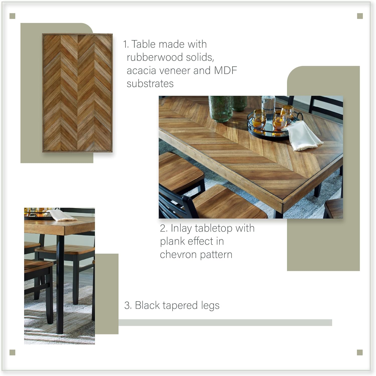 QUALITY CRAFTED: Table made with rubberwood solids, acacia veneer and MDF substrates. Inlay tabletop with plank effect in chevron pattern; black tapered legs. Black chair frame made with solid wood