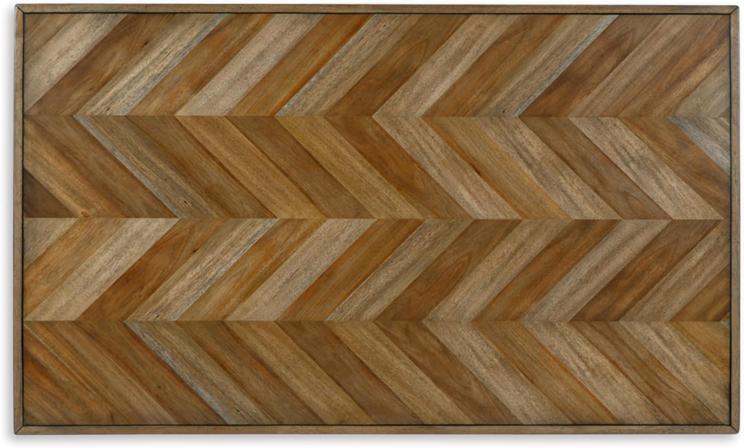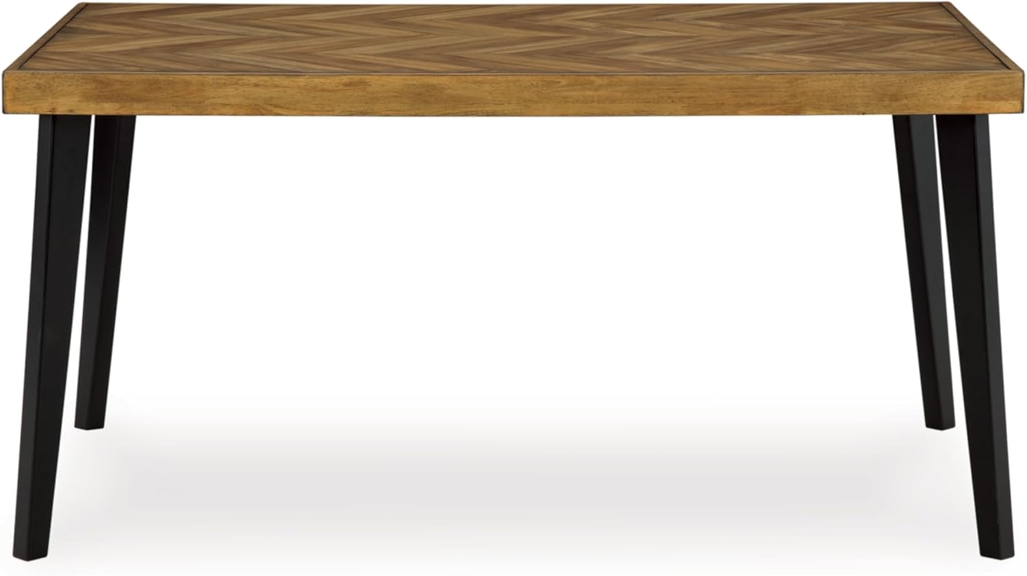 QUALITY CRAFTED: Table made with rubberwood solids, acacia veneer and MDF substrates. Inlay tabletop with plank effect in chevron pattern; black tapered legs. Black chair frame made with solid wood