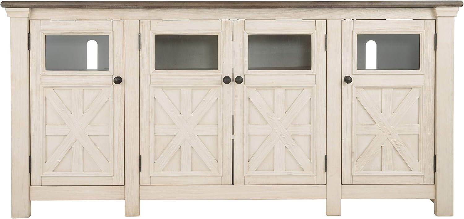 TRADITIONAL TV STAND: No matter your decor style, this classic TV stand will fit right in. It's finished in a two-tone, gently distressed effect in weathered oak and antique white for charming appeal