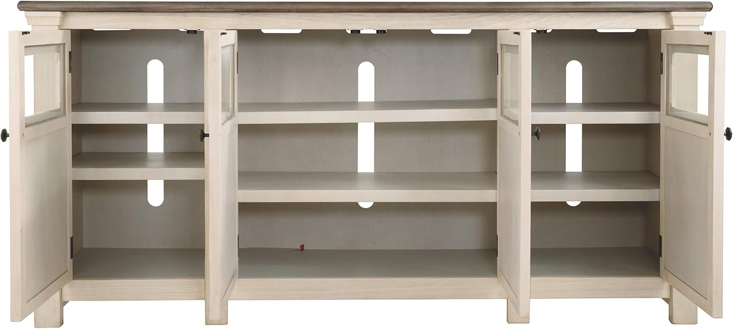 TRADITIONAL TV STAND: No matter your decor style, this classic TV stand will fit right in. It's finished in a two-tone, gently distressed effect in weathered oak and antique white for charming appeal