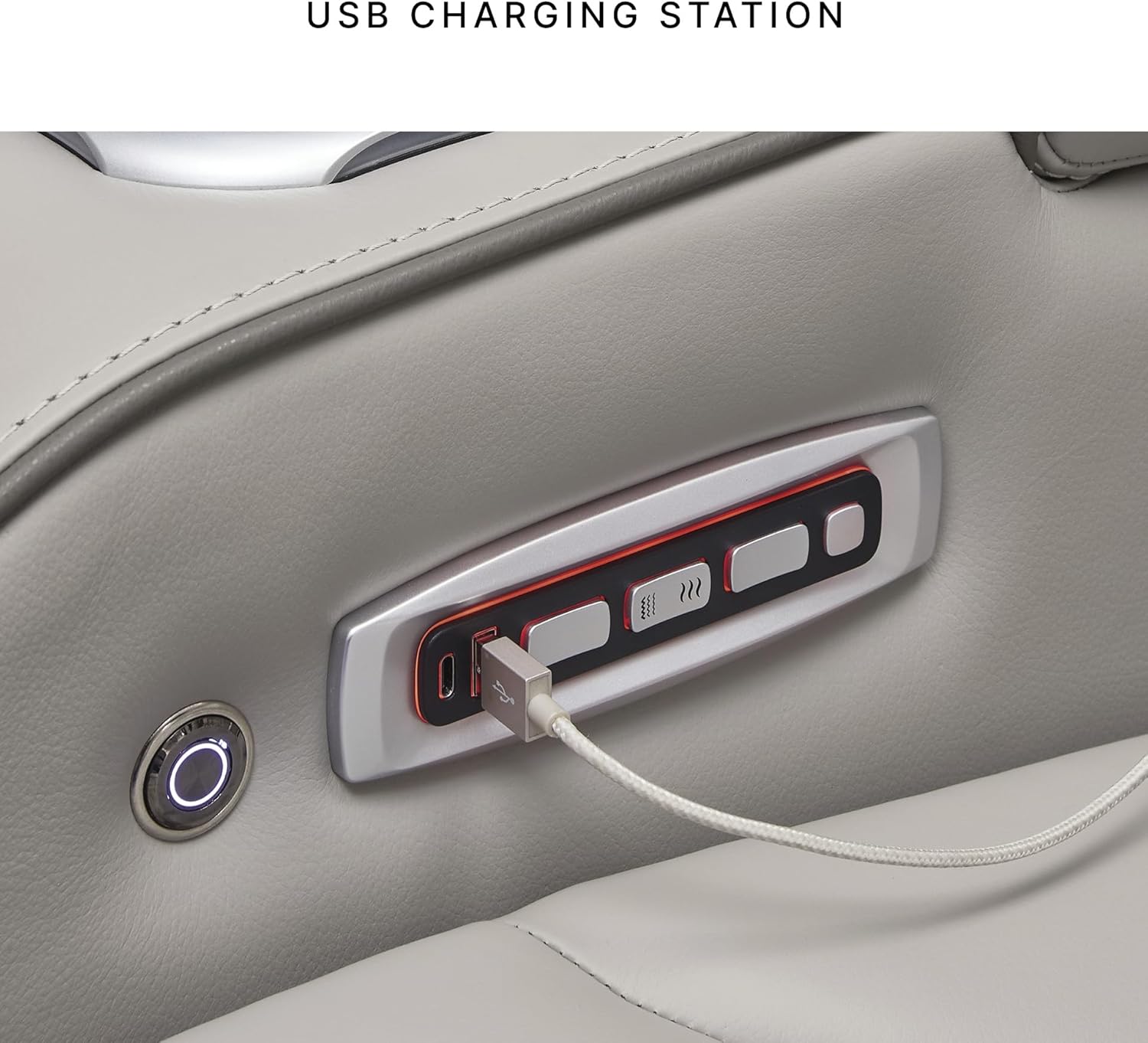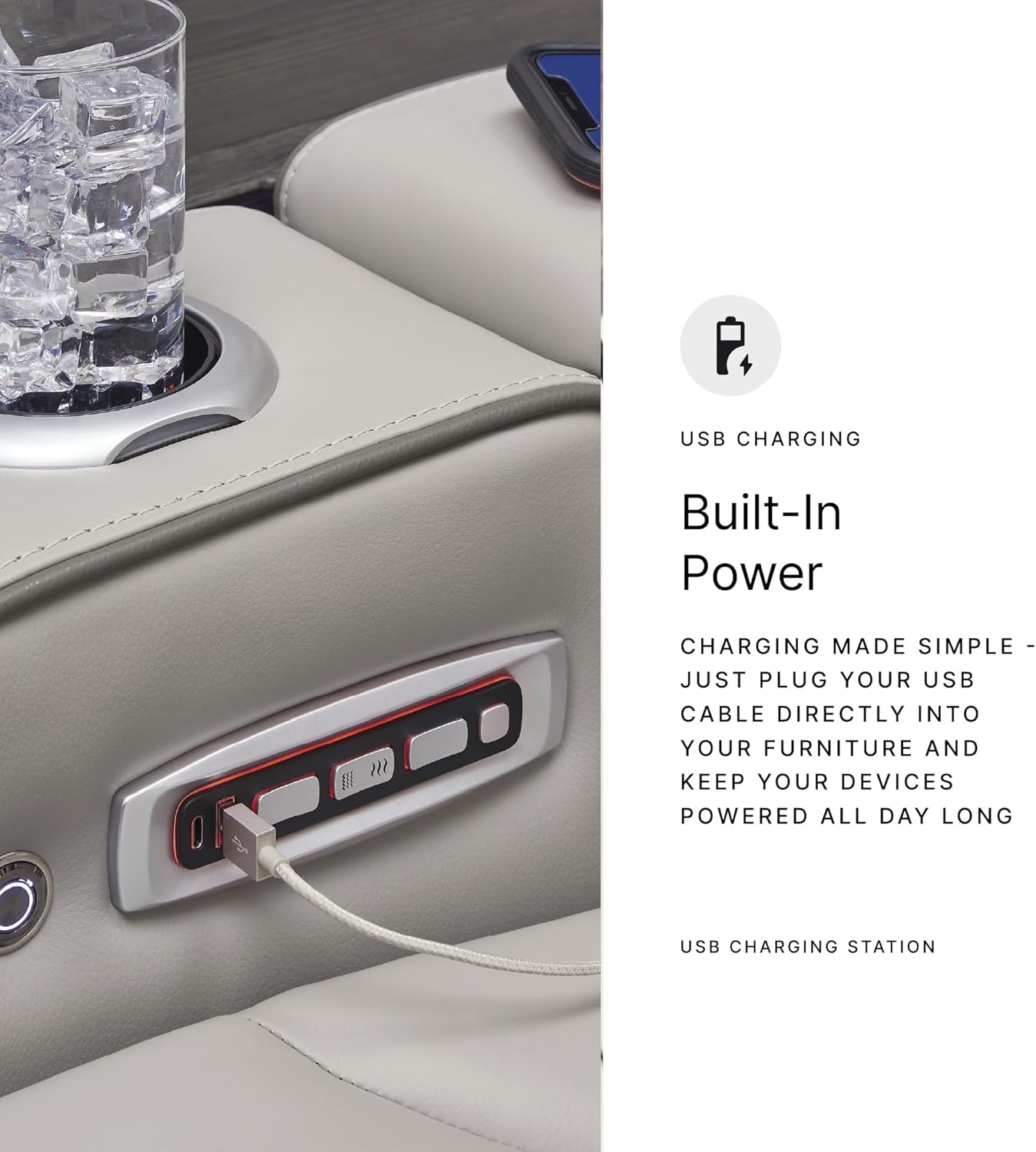 Upgrade your living room comfort with the Boyington Power Reclining Loveseat, designed for those who want more than just a seat. This luxurious loveseat combines advanced features with elegant style, making it perfect for family rooms or home theaters. At the touch of a button, you can recline into infinite positions with the zero-gravity mechanism and enjoy head-to-toe support thanks to the extended ottoman and Easy View adjustable headrest. Experience ultimate relaxation with the built-in air massage system that cycles through steady, pulse and wave settings, plus heated seats for soothing warmth. Ambient blue LED lighting creates a theater-style vibe, while the center console with cup holders and hidden storage keeps essentials close. Upholstered in 100% top grain leather in all seating areas with skillfully matched faux leather elsewhere, this loveseat offers durability and a sophisticated look. Reinforced frame and metal seat box ensure stability, while durable and comfortable foam cushions provide lasting comfort. With USB and wireless charging ports, you can keep devices powered without leaving your seat. Perfect for movie nights or unwinding after a long day, this reclining loveseat brings modern convenience and luxurious comfort to your home. Power cord included; UL Listed.