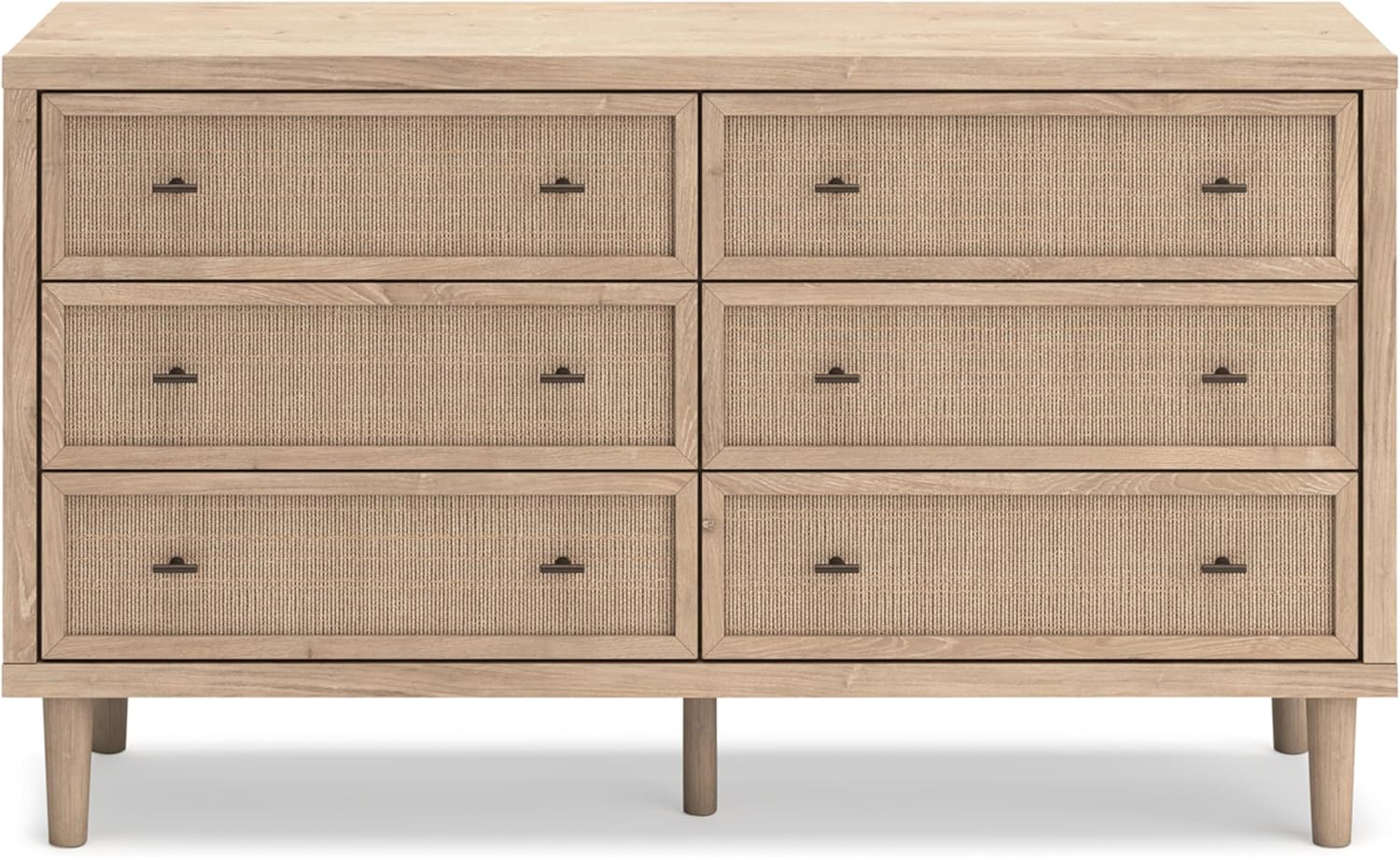 6-DRAWER DRESSER: This dresser is a fresh style awakening. Pairing a light finish with replicated oak grain & textured cane details, its mixed materials bring a natural, versatile vibe to your bedroom