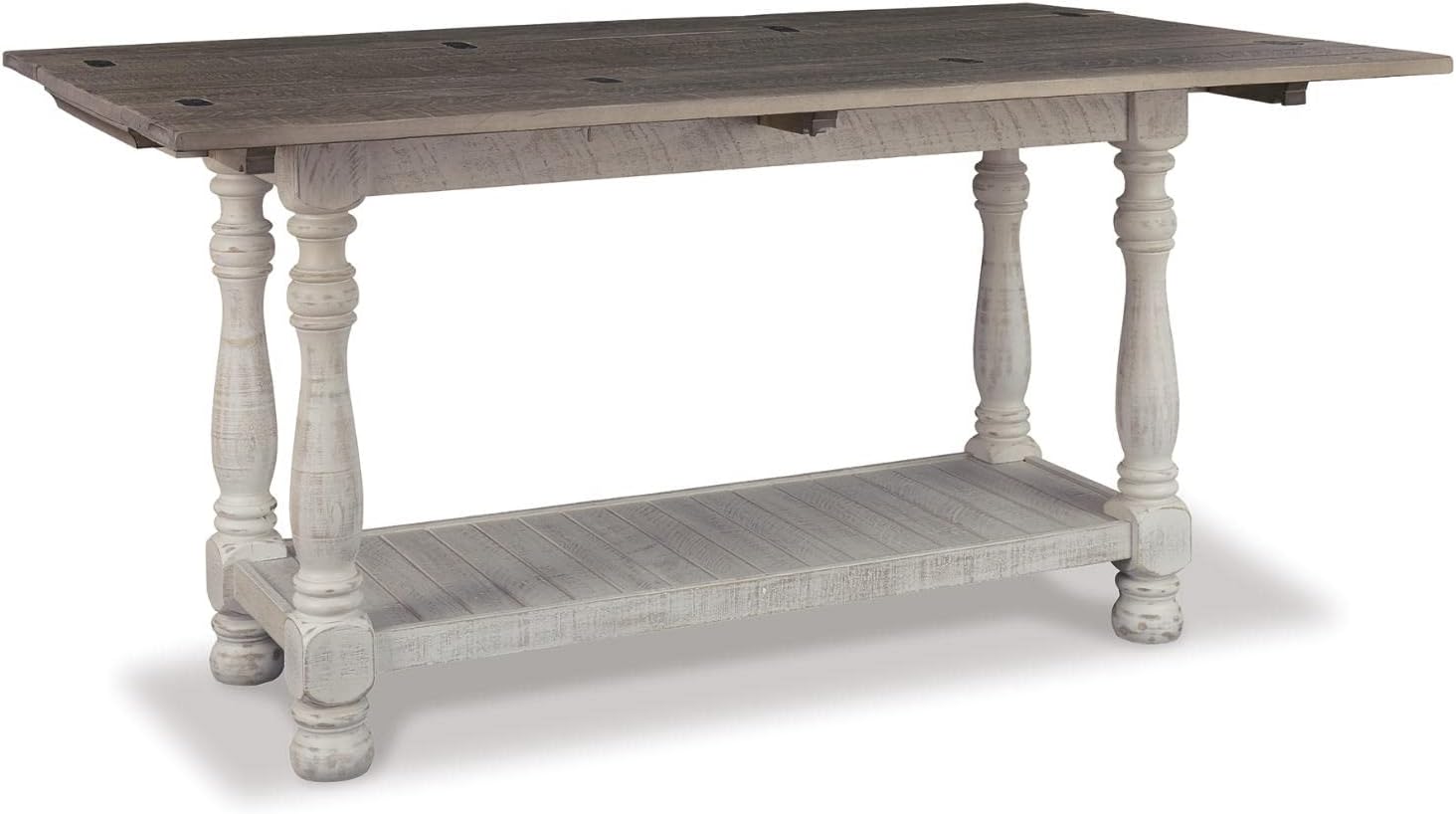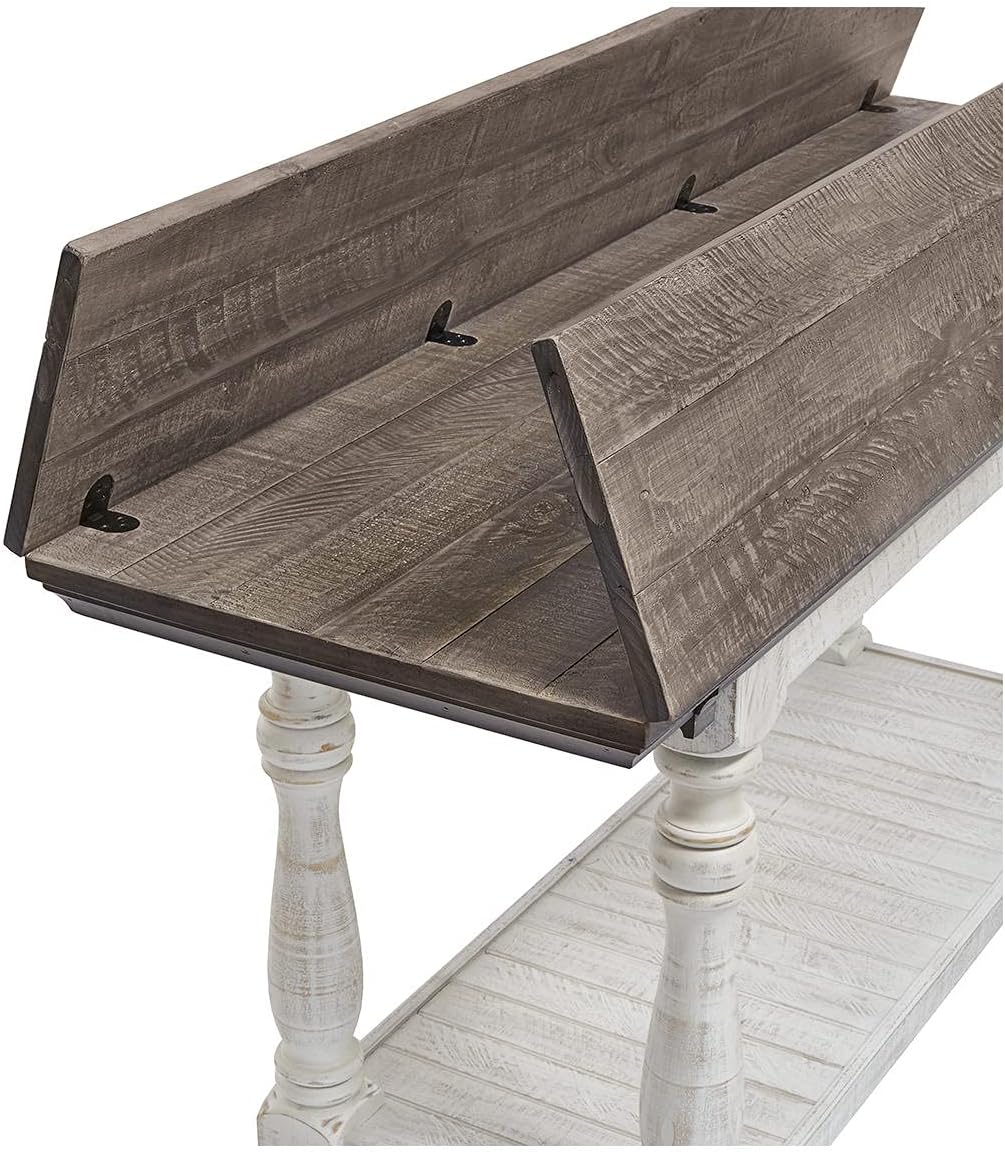 FARMHOUSE BEAUTY: With its richly rustic finish and textural mix this vintage casual sofa table is charming. Expecting company? Simply open the flip top panels to create additional dining space