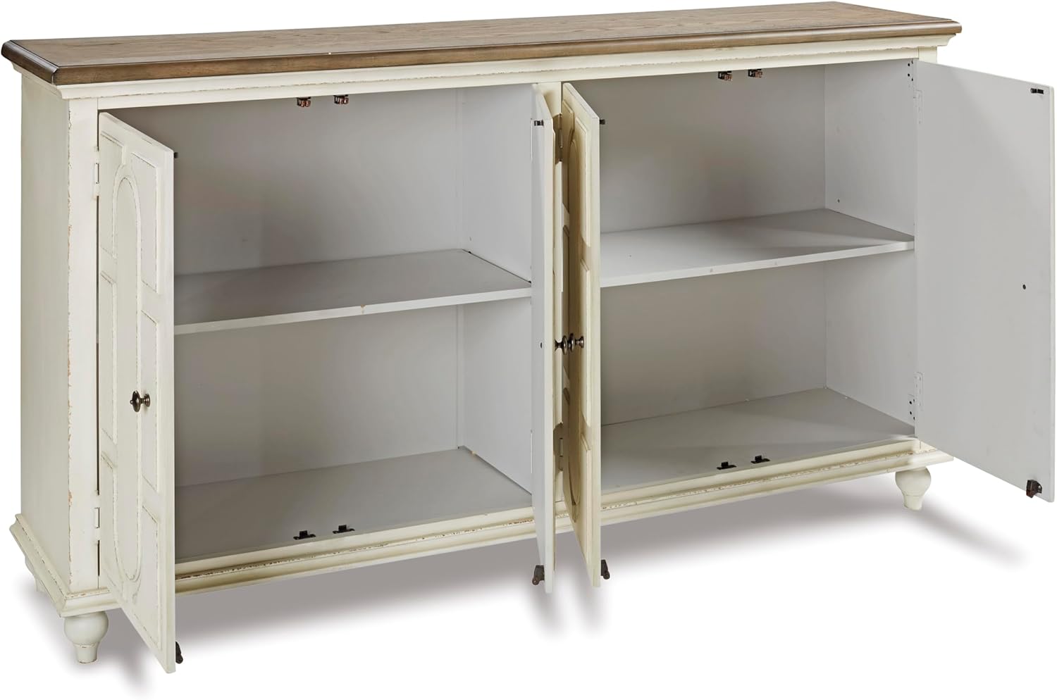TWO-TONE FURNITURE DESIGN: Wonderfully timeworn in antique white, this 4-door cabinet with 2 adjustable shelves, is topped with a warm brown finish for two-tone interest