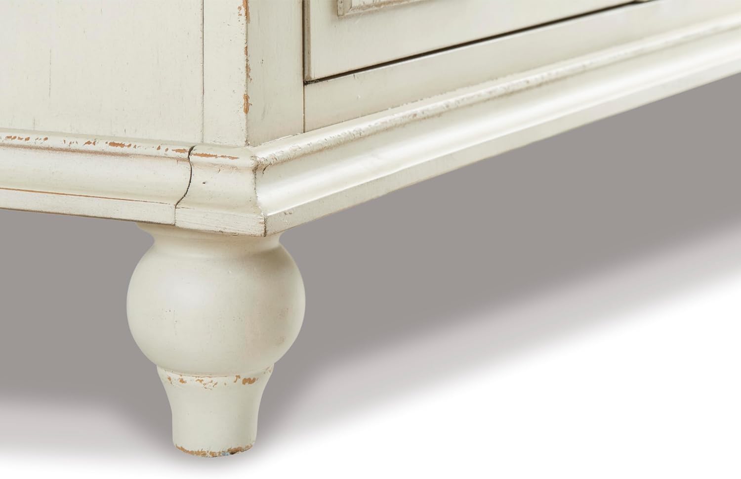Bring character and functionality to your space with the Roranville Accent Cabinet. Whether your home leans cottage chic, boho inspired or eclectic, this versatile storage cabinet blends seamlessly with a variety of decor styles. Its standout design features raised panel door fronts that feel like handcrafted art, finished in a beautifully distressed antique white for a timeworn look. A contrasting warm brown top adds two-tone charm, making this piece a stylish focal point for any living room, entryway or dining area. Behind four doors, two adjustable shelves provide flexible storage for everything from dinnerware to board games, helping you keep clutter out of sight. Bronze-tone metal door pulls complete the vintage-inspired aesthetic. Crafted from veneer, wood and engineered wood for durability, this accent cabinet offers both beauty and practicality. Assembly required.