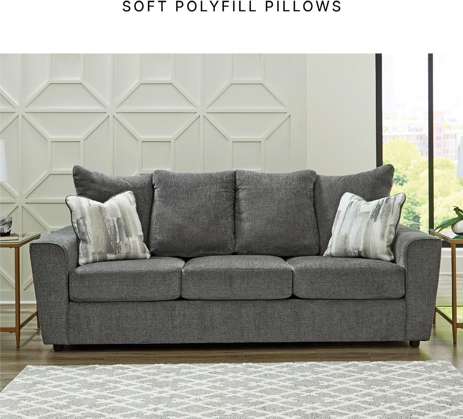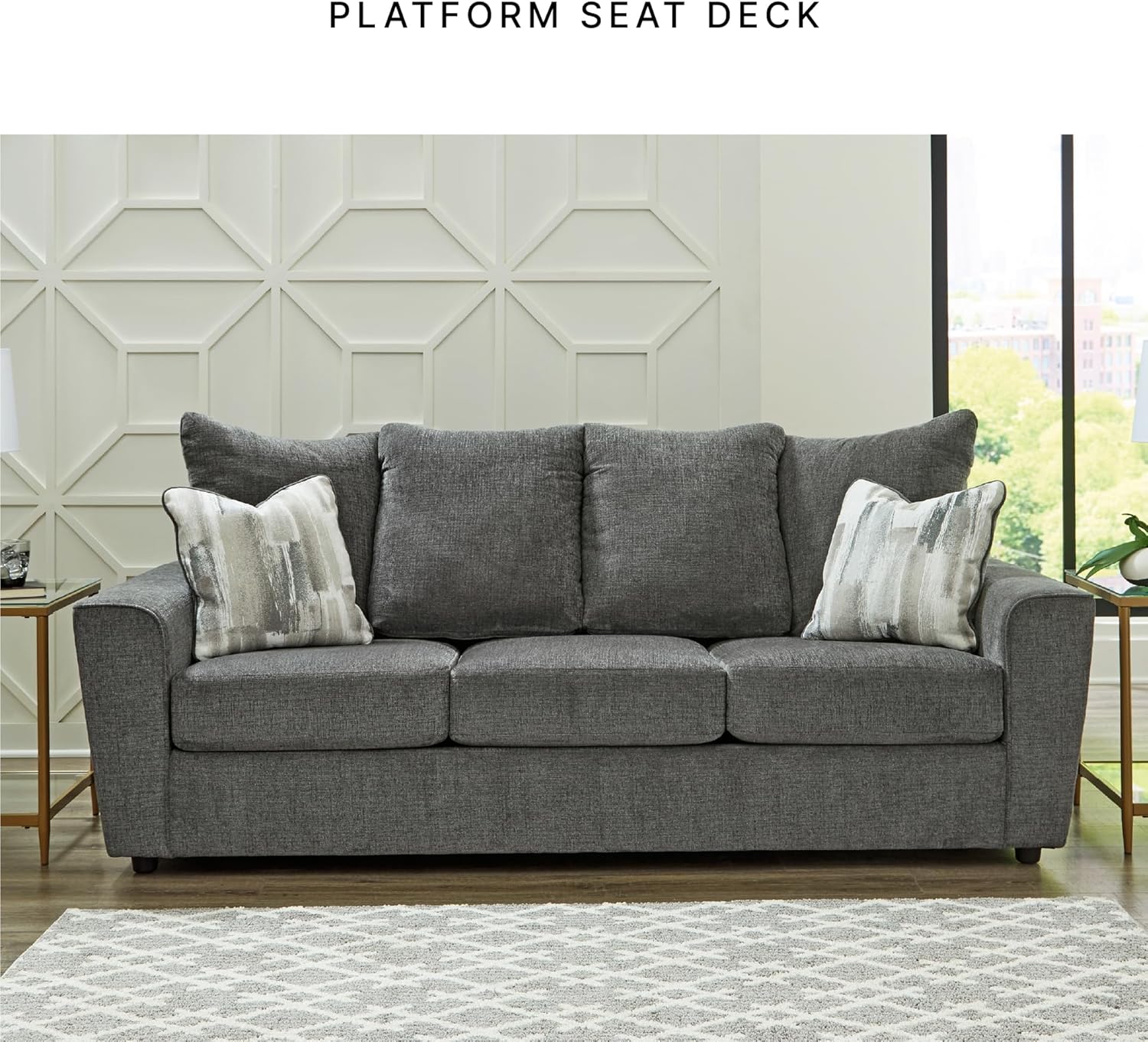 COMFY SEATING: Pair this sofa with chairs or a loveseat to create a modern seating area. Measures 86" W x 38" D x 39" H. Seat height: 19". Seat depth: 22". Arm height: 24"