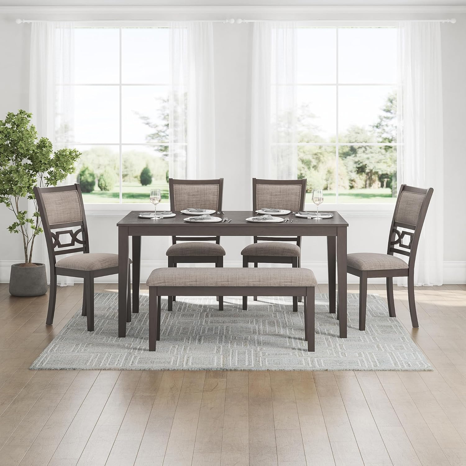 VERSATILE STYLE: The clean-lined profile & modern light gray finish pair with textured upholstery to create a timeless yet on-trend look. Chairs & a bench provide all the seating essentials you need