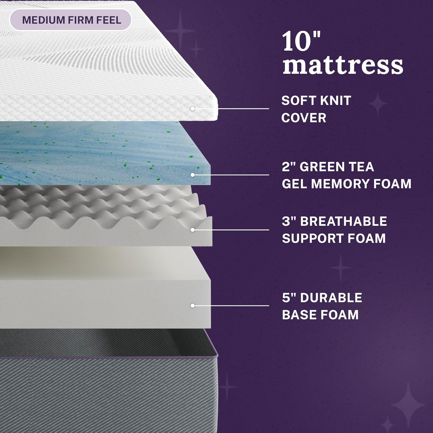 Enjoy simply better sleep with Marley. This 10 inch mattress offers the refreshing cool comfort you want with the medium firm support you need. A soft knit, breathable cover helps you instantly unwind. Cooling gel memory foam with fresh green tea helps maintain a comfortable temperature as you sleep, adapting to your body and relieving pressure points. This encourages long periods of undisturbed deep sleep. Air channel foam allows excess heat to move away from your space, enhancing the cool comfort. Durable support foam promotes gentle back and body alignment to keep your rest just as satisfyingly restorative for years of good nights.