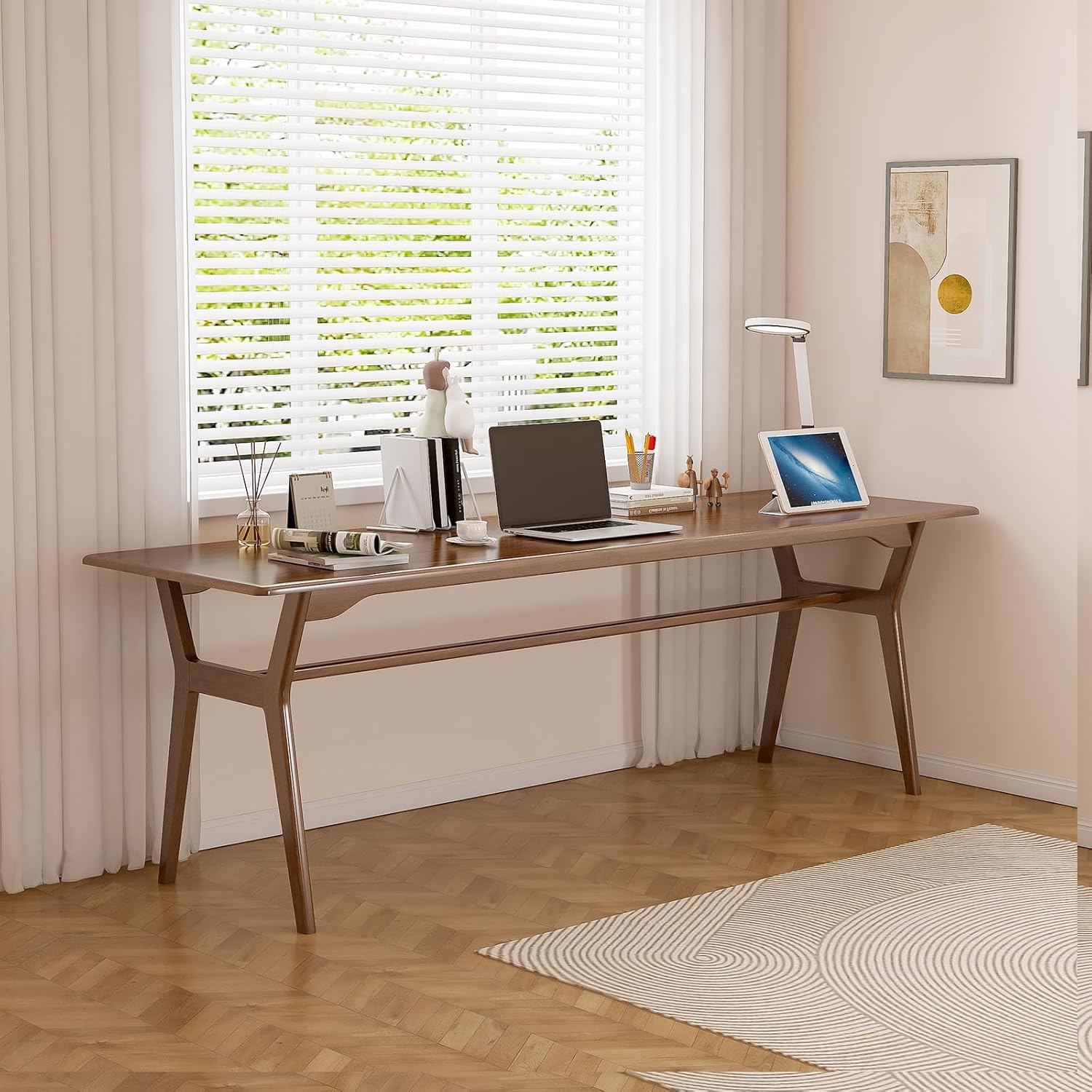 100% SOLID WOOD - This extra long table is entirely crafted from solid wood. The legs and frame are made of durable rubber wood, while the desktop features a high-quality multi-layered solid wood panel with fresh and delicate texture. It offers excellent load-bearing capacity, is resistant to warping or cracking, and ensures long-lasting sturdiness and durability;